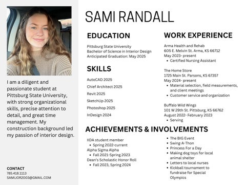 I am a diligent and passionate student at Pittsburg State University, with strong organizational skills, precise attention to detail, and great time management. My construction background led my passion of interior design.