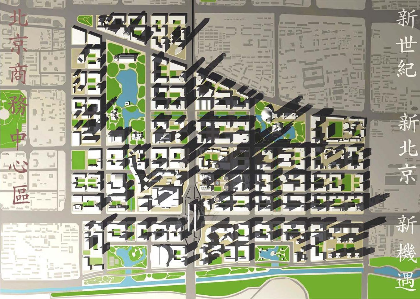 Drawing from traditional Chinese city planning, the master plan divides the site into four distinct districts, each centered around a prominent public park Each of these parks is connected to the others by four additional linear parks, forming an overall open space network. The park network contains a ‘necklace’ of premier cultural institutions. The plan draws from historic organizing principles that contribute to Beijing’s distinct identity: lakes linked by canals; a strong plan geometry with axial views; large ‘super-block’ development areas with through-block walking streets (hutongs); distinct gateway entrances; sun access that helps to provide heat for housing units during cold weather; and thematic open space. Respectful of its urban context, the plan also establishes a unique skyline for the CBD while fully integrating it with its surroundings. Since 2001, Beijing’s CBD has emerged as China’s primary global business address, drawing more than 117 Fortune 500 businesses in the financial, media, information technology, and consulting service industries.