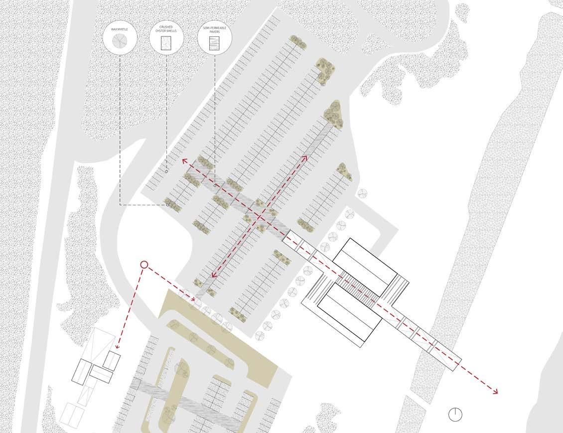 Designing on a barrier island poses several challenges and opportunities as one navigates an ecologically sensitive, yet biodiverse landscape. This project re-imagines the Ranger Station, a building often visited by overnight campers, as part of an “educational landscape”. The building itself teaches about the importance of storm-ready design and features a ramped landscape that pays homage to the sand dunes of Assateague Island. This project also includes a proposed Resiliency Masterplan for Assateague Island State Park, one that introduces the use of permeable materials like crushed oyster shells in lieu of asphalt and increasing overhead shade opportunities to improve visitor comfort.