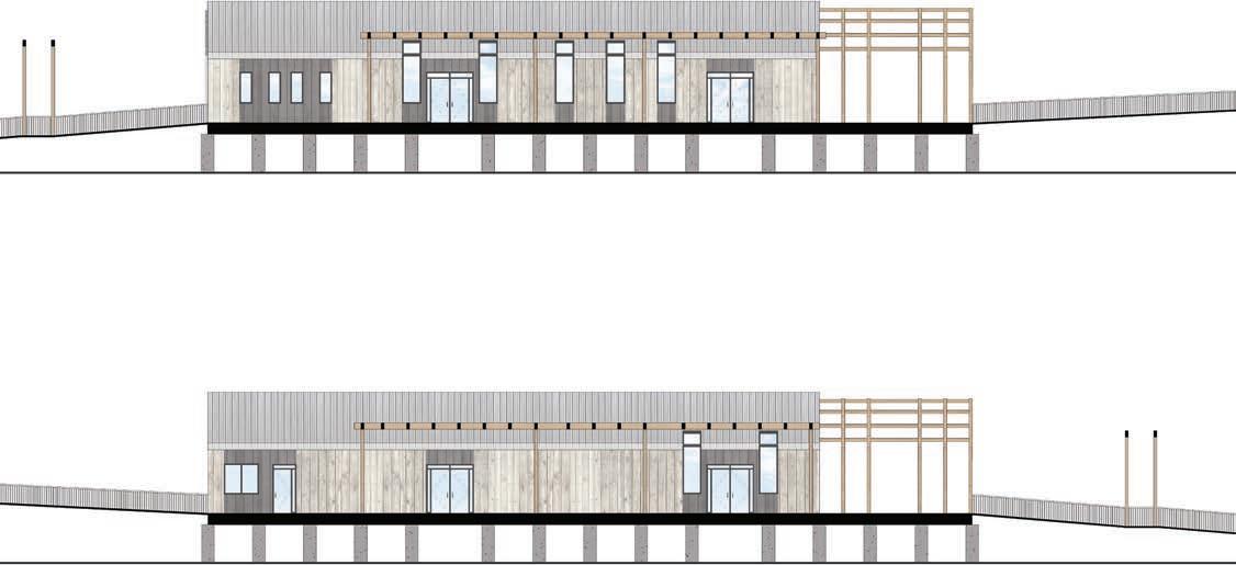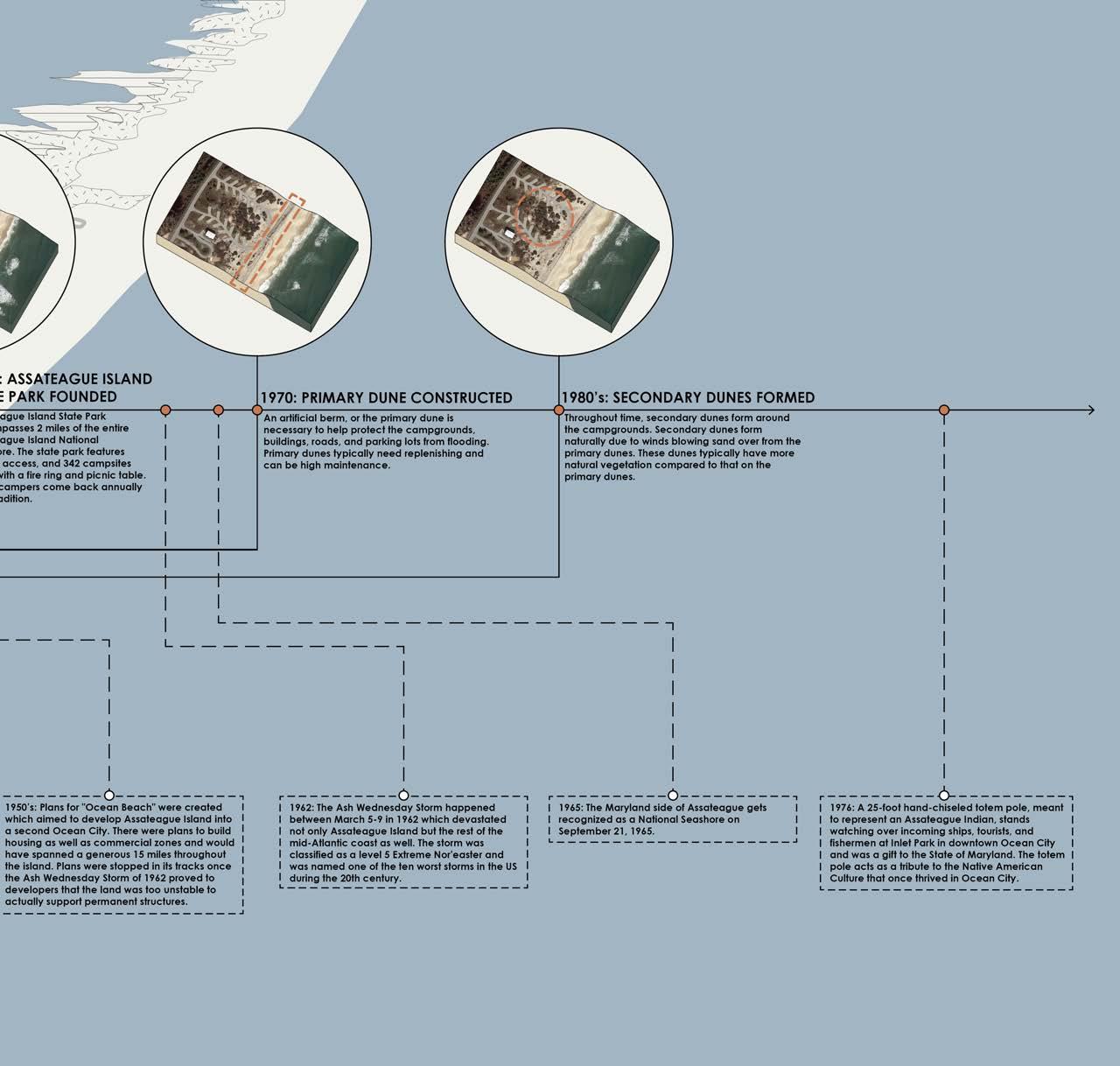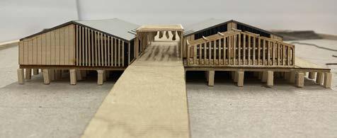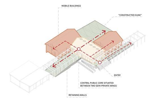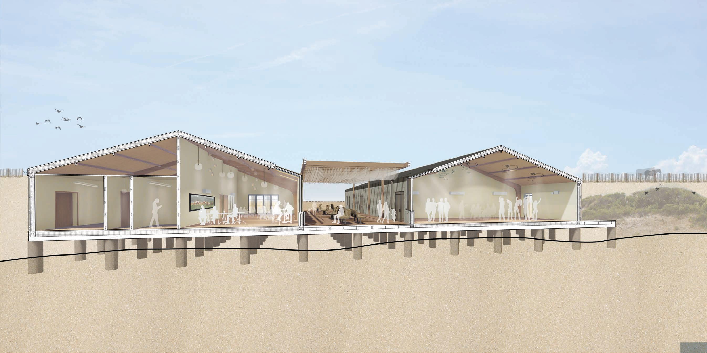 Inspired by the ecotones on Assateague Island State Park, this design establishes meaningful transition points within the promenade to the beach as well as passive design strategies in the DayUse Building. This design proposes a wider boardwalk to facilitate circulation as well as create informal moments of pause. This broader boardwalk coupled with a woodframe trellis features a draping fabric sculpture which highlights the inviting northeast prevailing wind as it enhances both the visual and kinesthetic experience of the winds.