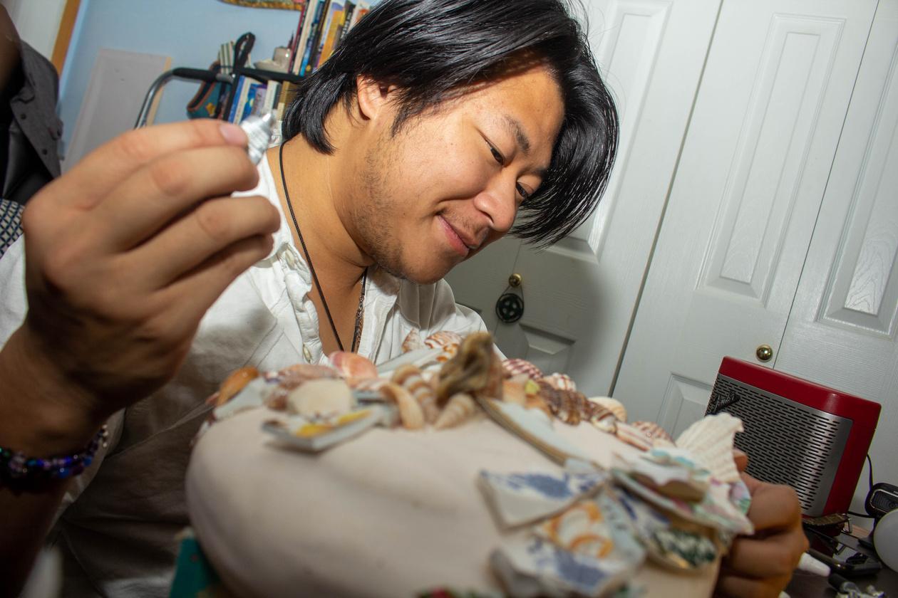 Raising the mask on a box, Tri Duong focuses on covering the edges of his mask with seashells in Loveland, CO. Duong held pieces onto the mask for minutes at a time to allow the glue to completely dry (Dec. 2, 2022).