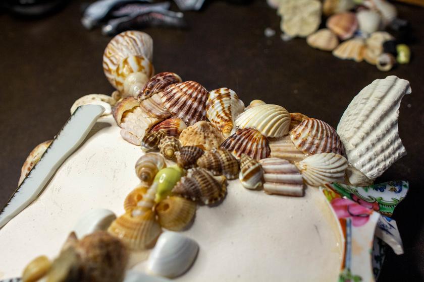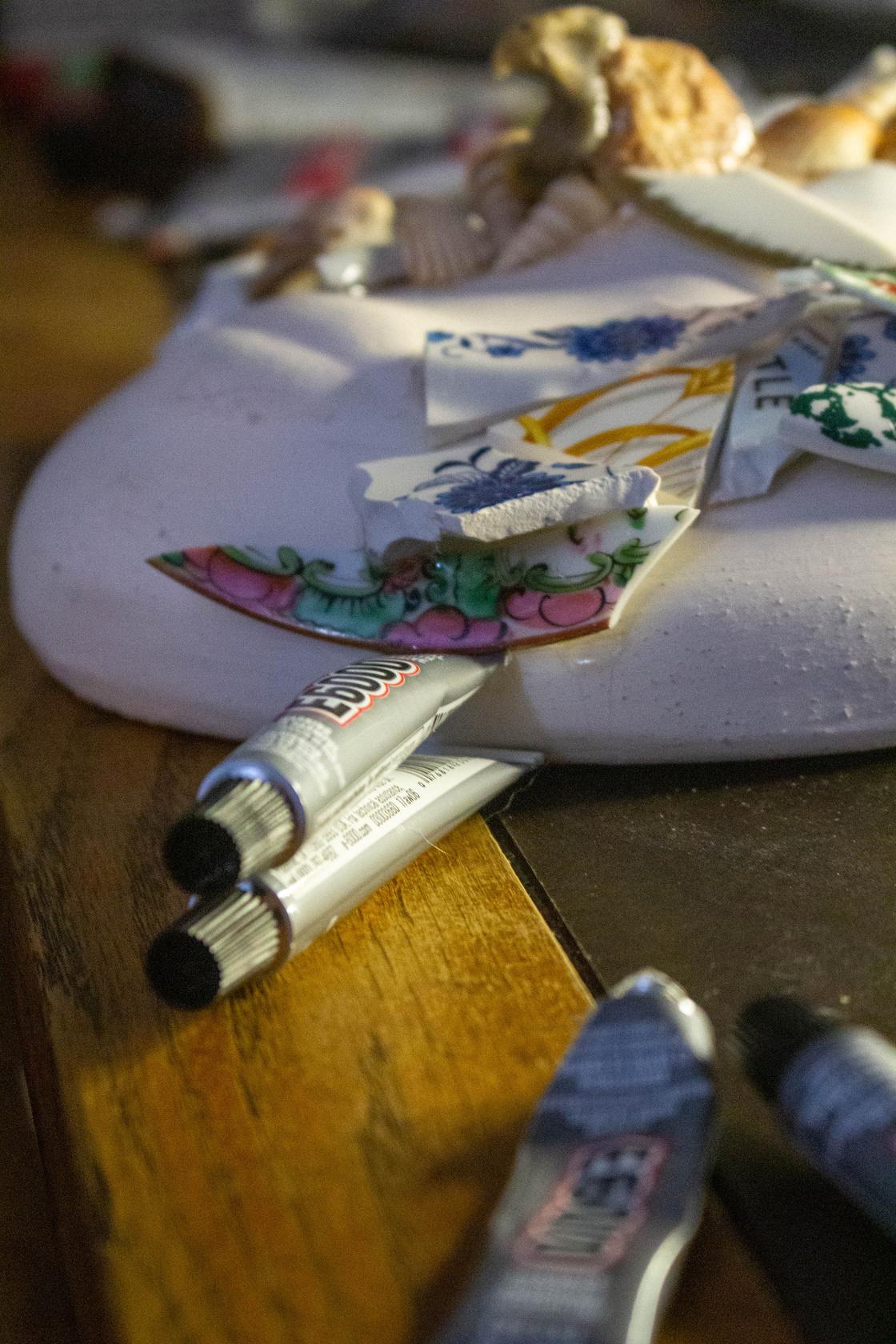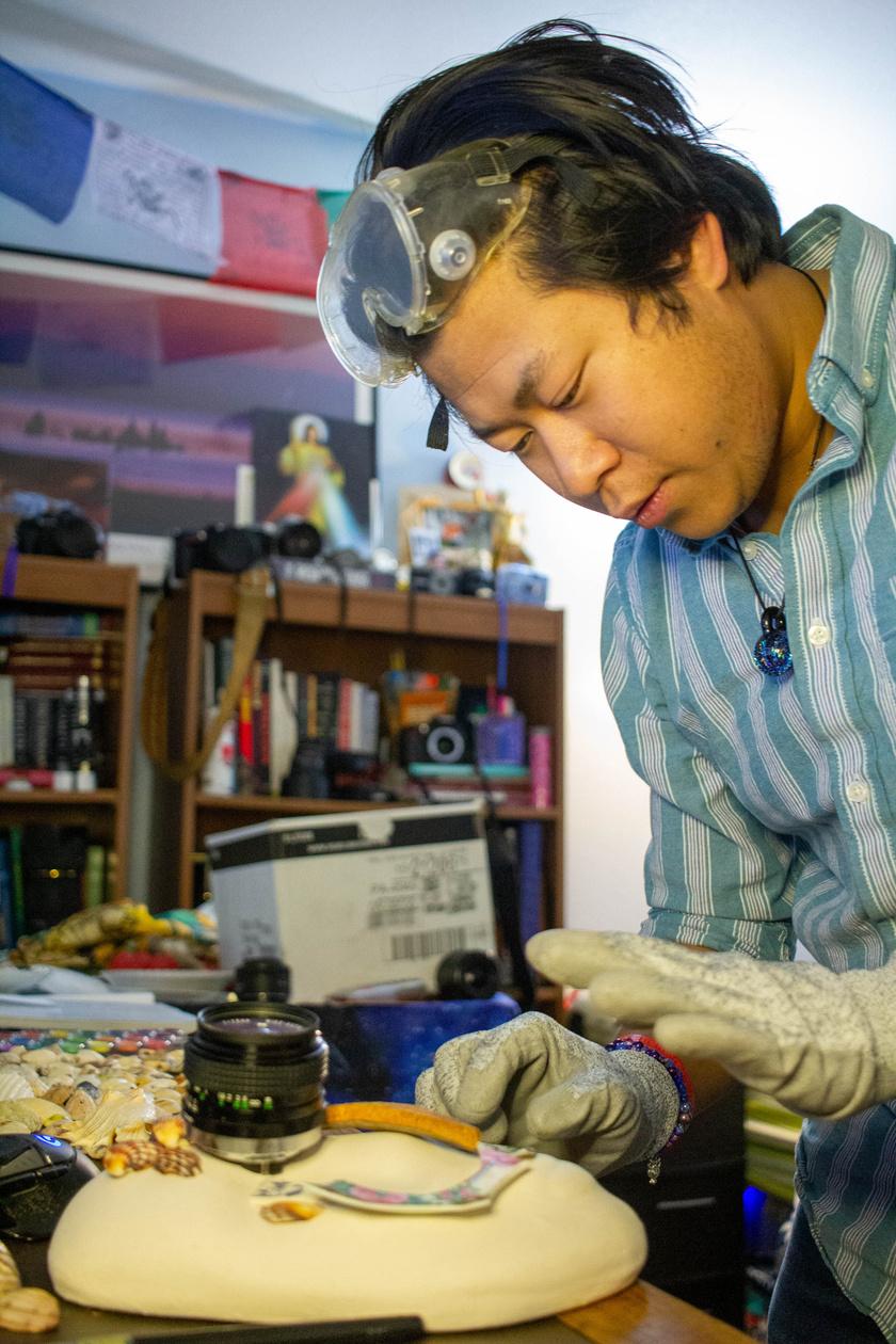 Tri Duong glues shells and China into place on the mask in Loveland, CO. Duong went through several tubes of glue while making the mask (Dec. 2, 2022.).