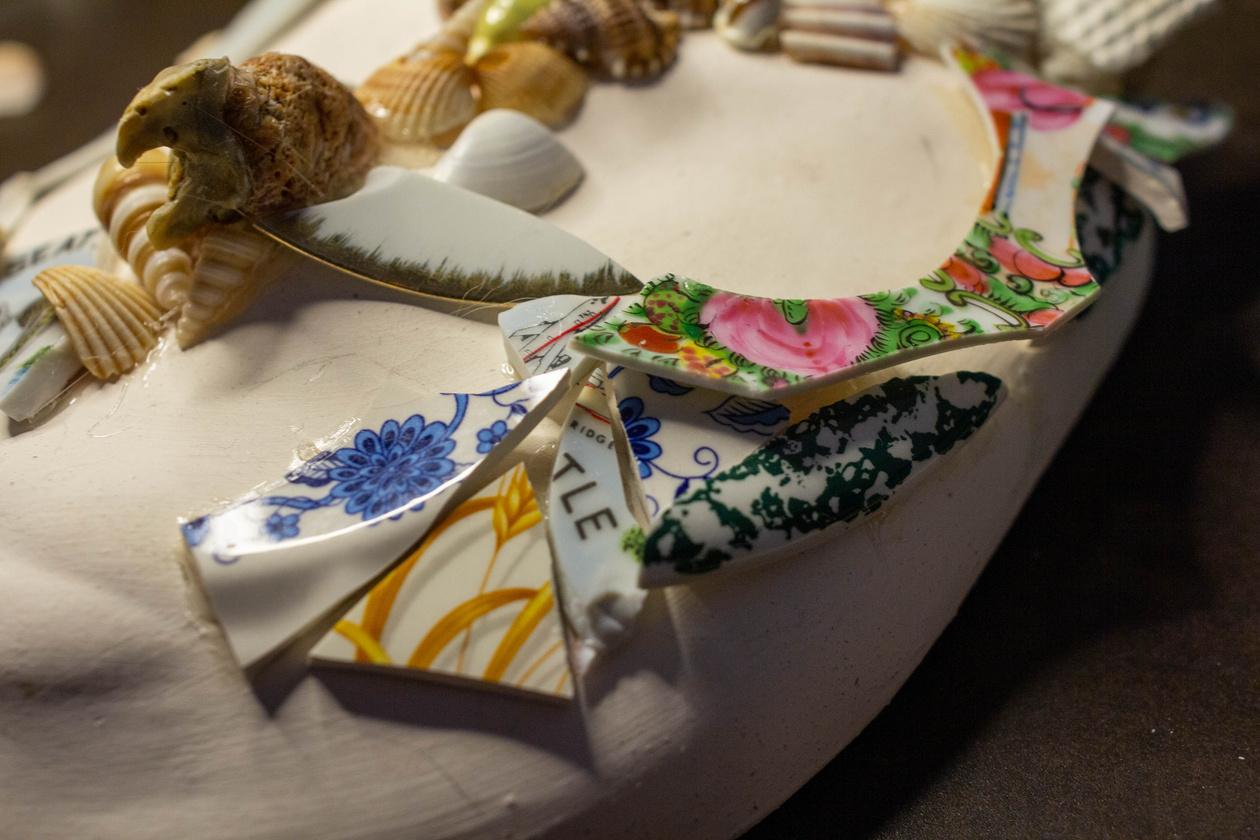 Duong thrifted the China pieces, which form the bottom and left side of the mask, from thrift stores in Fort Collins The China represents the people that he comes across in his life The China pieces are very different, like people, but each person he meets leaves a piece of themselves with him, and they come together to shape him into the person behind the mask.