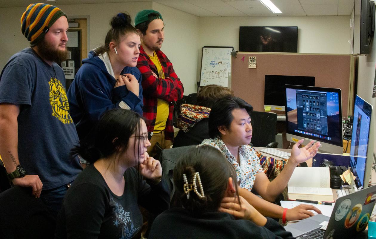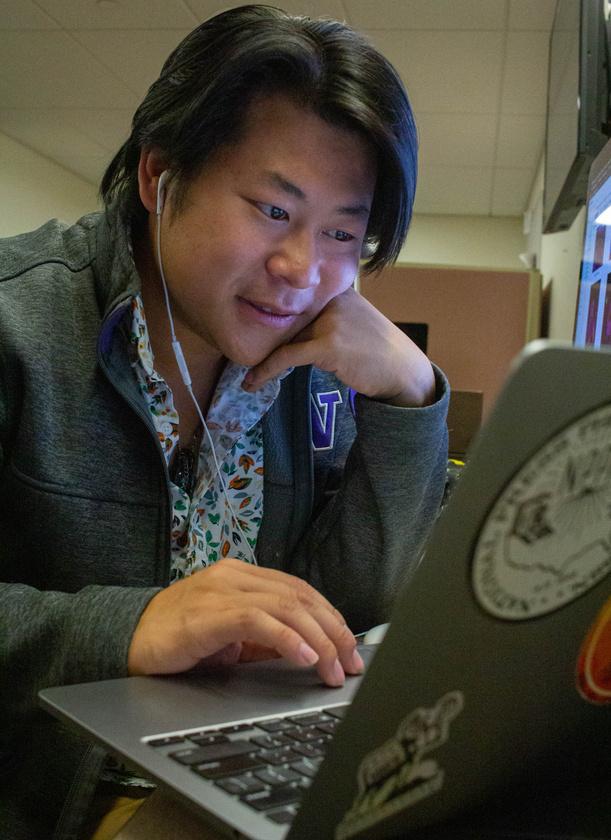 Looking at his laptop, Tri Duong checks a spreadsheet to ensure he is editing photos on schedule, and photographers are getting their photos in on time in the Rocky Mountain Student Media newsroom at Colorado State University in Fort Collins, CO (Nov 1, 2022)