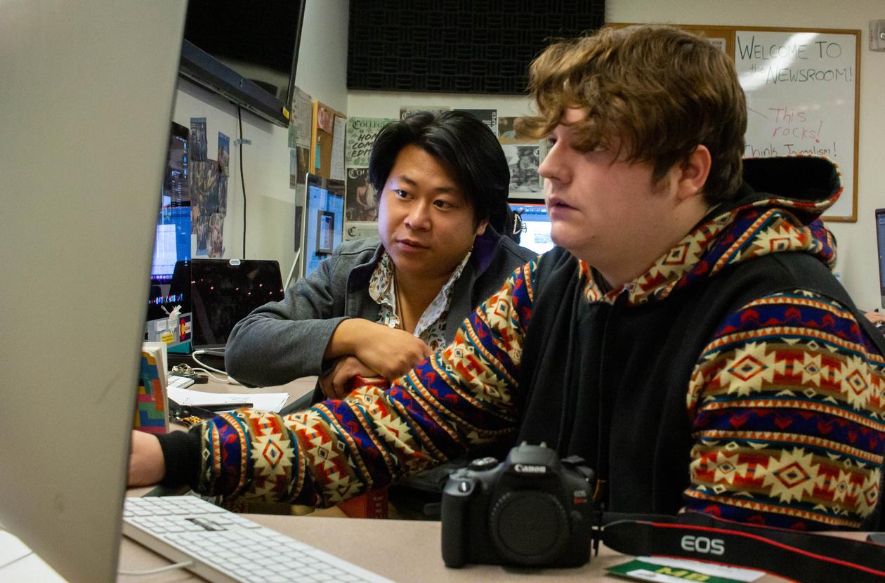 Tri Duong teaches new photographer River Kinnaird how to upload and import photos into Adobe Lightroom Classic in the Rocky Mountain Student Media newsroom at Colorado State University in Fort Collins, CO Duong’s duties as CoPhoto Director of the Collegian also include teaching new photographers the post-production process (Nov 1, 2022)
