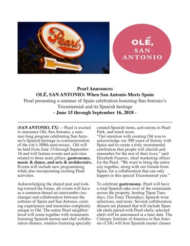 Pearl Announces OLÉ, SAN ANTONIO: When San Antonio Meets Spain Pearl presenting a summer of Spain celebration honoring San Antonio’s Tricentennial and its Spanish heritage - June 15 through September 16, 2018 (SAN ANTONIO, TX) – Pearl is excited to announce Olé, San Antonio, a summer-long program celebrating San Antonio's Spanish heritage in commemoration of the city's 300th anniversary. Olé will be held from June 15 through September 16 and will feature events and activities related to three main pillars: gastronomy, music & dance, and arts & architecture. Events will include new programming while also incorporating existing Pearl activities.