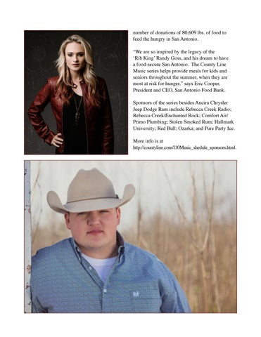 number of donations of 80,609 lbs. of food to feed the hungry in San Antonio. “We are so inspired by the legacy of the ‘Rib King’ Randy Goss, and his dream to have a food-secure San Antonio. The County Line Music series helps provide meals for kids and seniors throughout the summer, when they are most at risk for hunger,” says Eric Cooper, President and CEO, San Antonio Food Bank. Sponsors of the series besides Ancira Chrysler Jeep Dodge Ram include Rebecca Creek Radio; Rebecca Creek/Enchanted Rock; Comfort Air/ Primo Plumbing; Stolen Smoked Rum; Hallmark University; Red Bull; Ozarka; and Pure Party Ice. More info is at http://countyline.com/I10Music_shedule_sponsors.html.