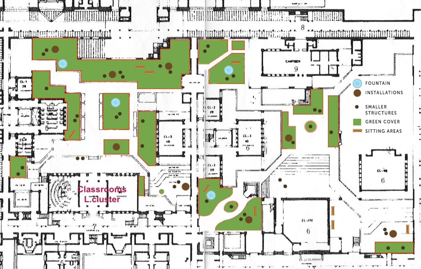 We had to create social interventions across the campus to increase the interaction between the students and these spaces. The proposed idea here, is to introduce various structures that involve sound, smell and touch like fountains, installations to intrigue students and bring them together thereby increasing interaction.