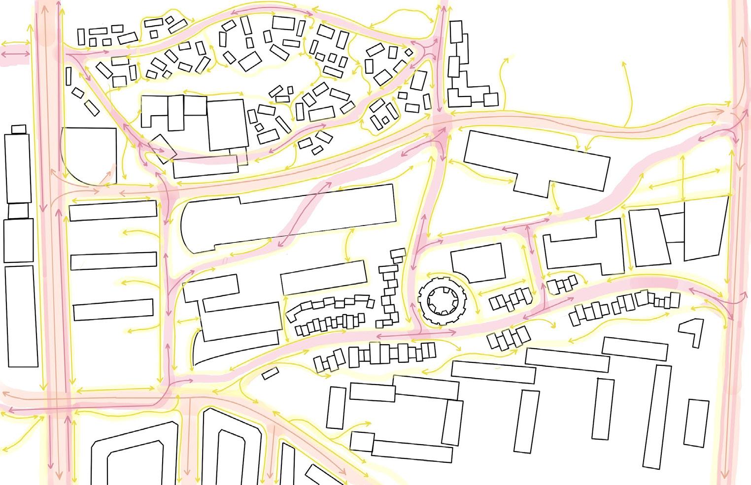In the first Sector of Superkilen+, the market stalls are bisected by a bike and pedestrian path, leading to the intersection at Økonomi Kollegium. The temporary seasonal markets are located between the Northern edge and Kindergarten.