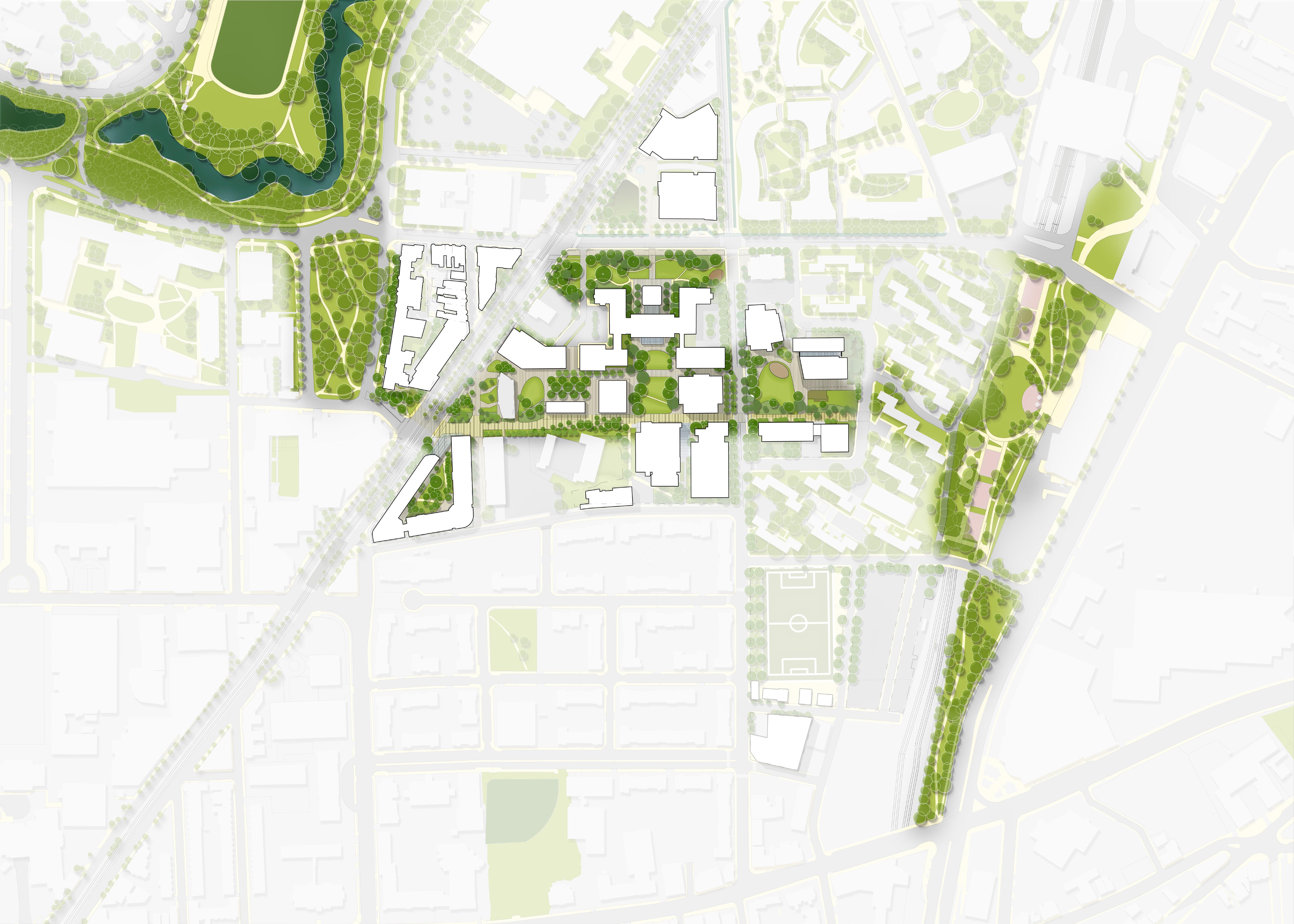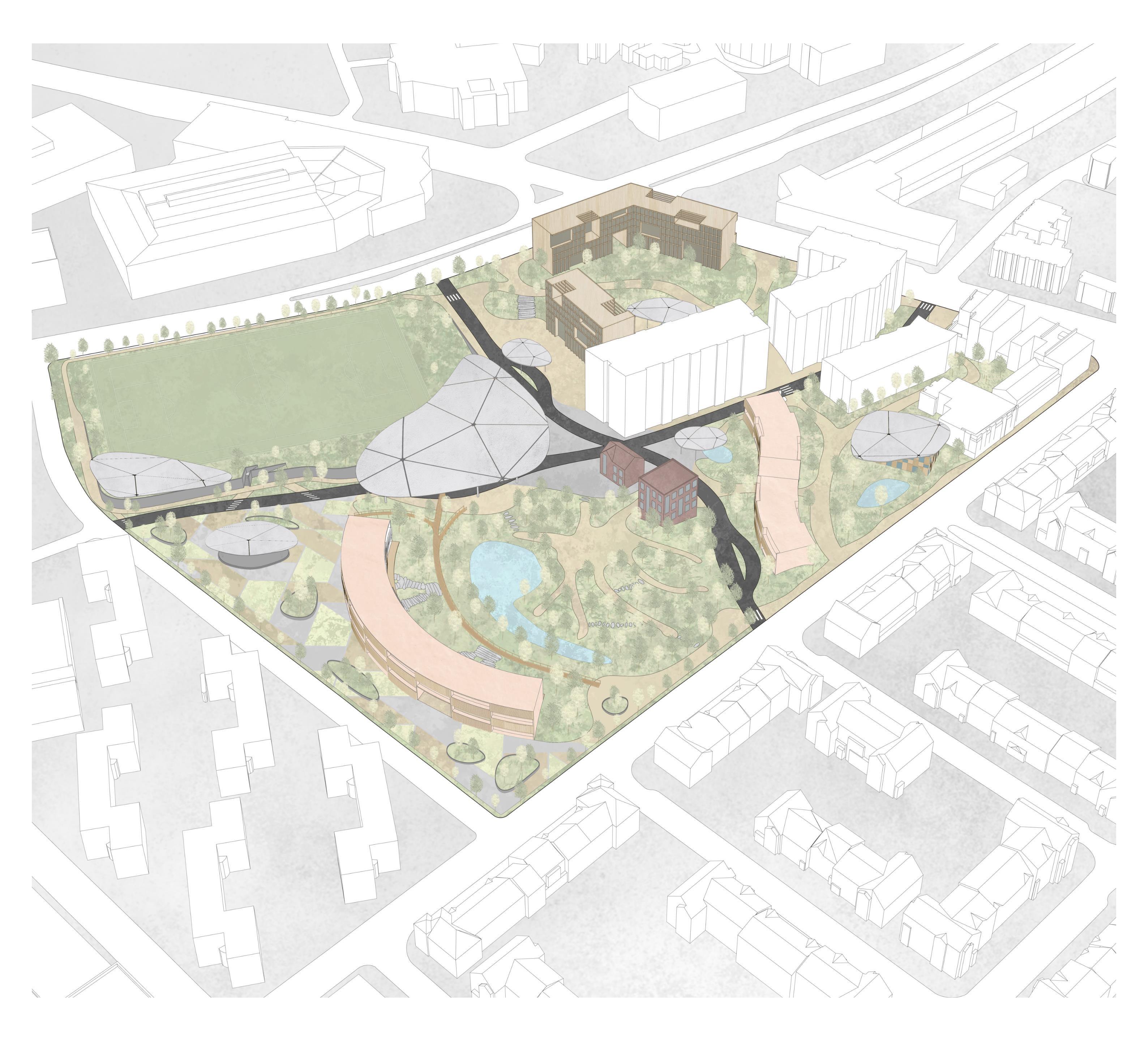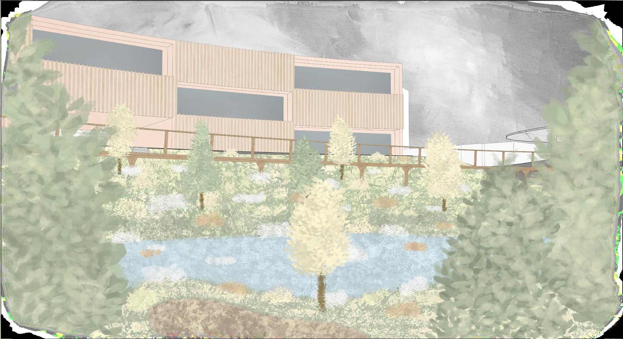 A sunken corridor bisects the site, delineating private and public space. Abundant bands of nature permeate the site, providing ample space in the south park for patrons to study or recline. Academic spaces draw students in at the south end of the site.