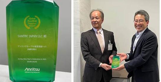 Samtec Japan received a Global Supplier Excellence Award from our customer Anritsu. They use FireFly products in their high-end 5G test stations. During the last 20 months or so, thanks to the tremendous efforts of our Operations and Sales Teams, we were able to meet their supply needs. The award is pictured below left, and Samtec’s Ritsuo Hayashi, the gentlemen on the left side of the other picture, is shown receiving the award on behalf of Samtec!