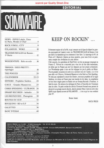 Evénement majeur de la fin 86, et qui consacre sur la ligne de départ les grandes nouveautés de l'année à venir, les TRANSMUSICALES de Rennes n'ont pas failli à la réputation qu'on commence à leur faire. Le reportage de M. de Floris et F. Martorel s'étalera sur deux numéros, pour nous livrer un panorama complet des révélations de cette édition. Côté concerts, les australiens de Died Preity ont fait un passage remarqué en France (C. Prévost les a rencontré p u r vous lors de leur date toulousaine, de même que les Pogues qui ont l'air dépassés par leur propre avènement). Les Woodentops quant à eux ont fait trépigner de joie le public du Bikini. Peu de grandes occasions de sortir en ce premier mois de l'année, si ce n'est p u r aller voir üitravox, Orchestral Manœuvre in the Dark ou Chns Spedding. Ne ratez pas cependant le concert des Sinners, nouveaux prophètes de la vague Suédoise, de retour en France pour une tournée de dix dates, la compilation de tous leurs singles parus en Suède sort sur Swamp Records à Toulouse, le label du mois. On retrouve les rubriques Ici Paris et Nouvelles de llAtomium dans les infos. Un petit crochet du côté de Clermont-Ferrand nous permet de découvrir un groupe encore discret, dont le premier Maxi vient de sortir chez Spliff et qui répond au nom de FOLAMOUR ...c'est ce qu'on vous souhaite pour 87. Bonne Année ROCK PRESS