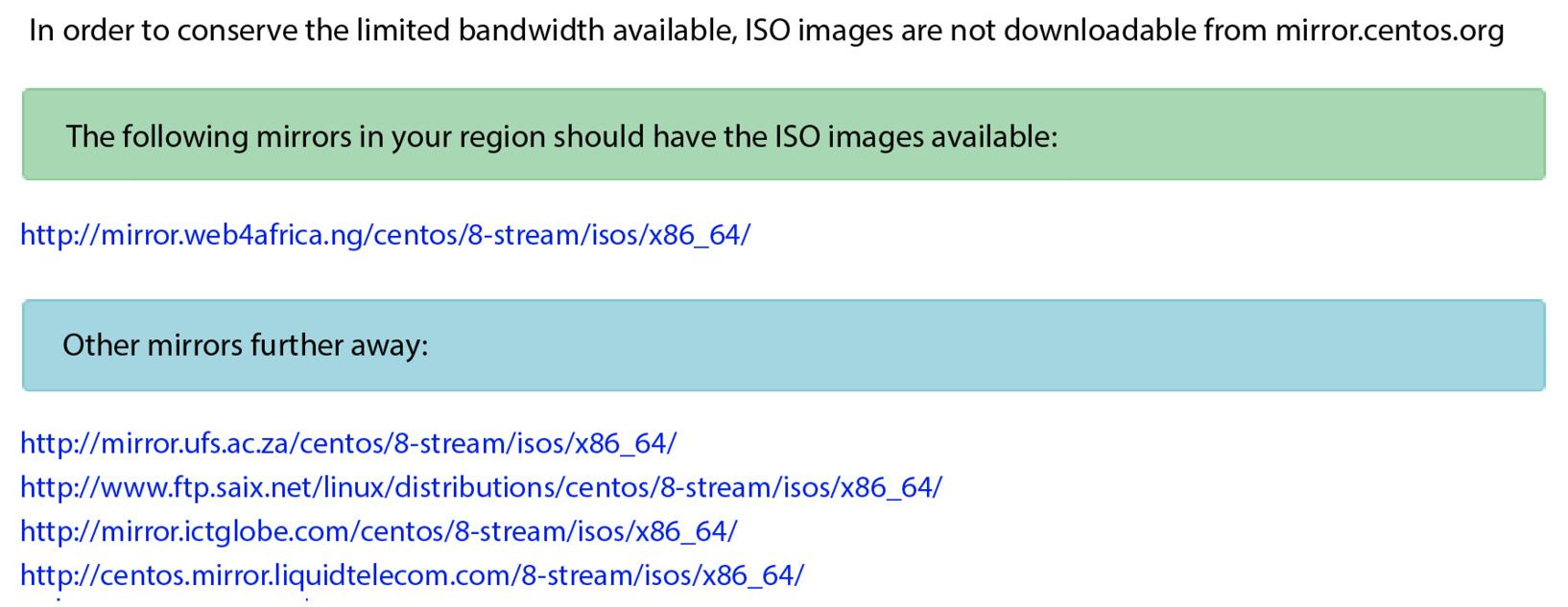 3. Next, we select the available link for our region. As we can see from the figure, mine is http://mirror.web4africa.ng/centos/8-stream/isos/x86 64/: