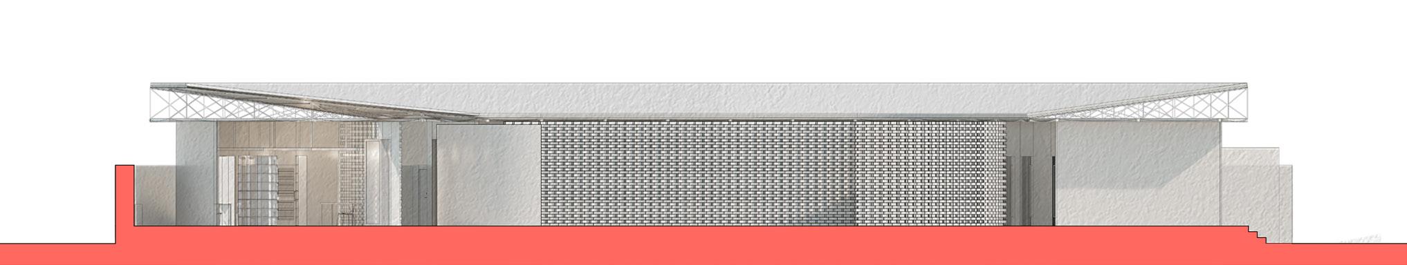 This section shows the relationship between the community space, the outdoor space, and the sculpture garden. Showing the relationship of the topography and the parking below