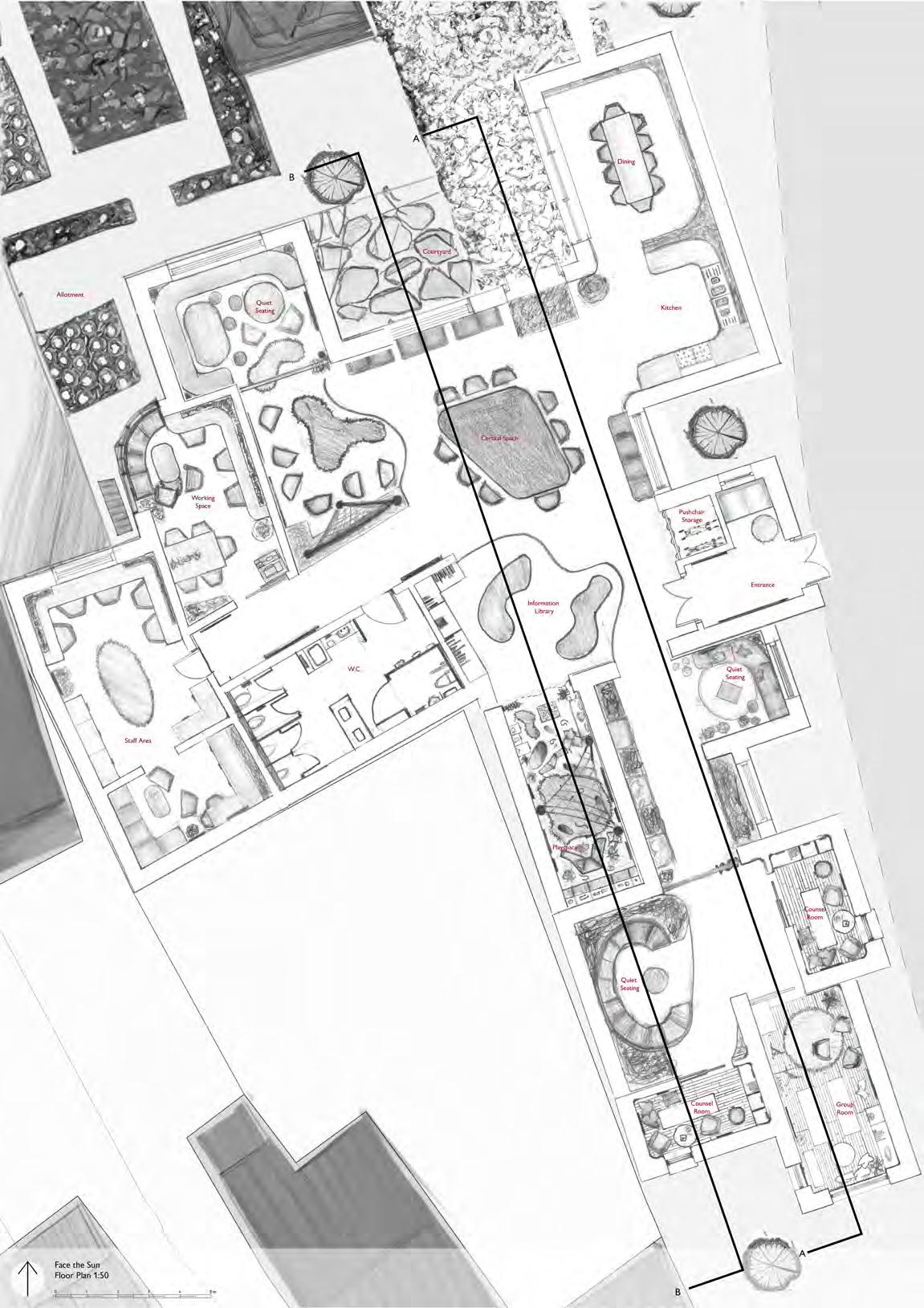 After my visit to the Maggie Centre, I realised that the site boundary could be expanded to create a better integration with the surrounding recreational ground. This would not only provide more space but also make the centre more accessible to the community. Furthermore, staff members at the Maggie Centre had suggested the addition of new rooms, such as those needed by Domestic Abuse Support UK. My proposals aimed to incorporate these new rooms while also taking into account the existing trees on site. By working around the tree located in the center of the site, the design aimed to preserve the natural elements while creating a cohesive and functional space. This approach ensured that the design of the centre remained sensitive to the needs of the community and the surrounding environment.