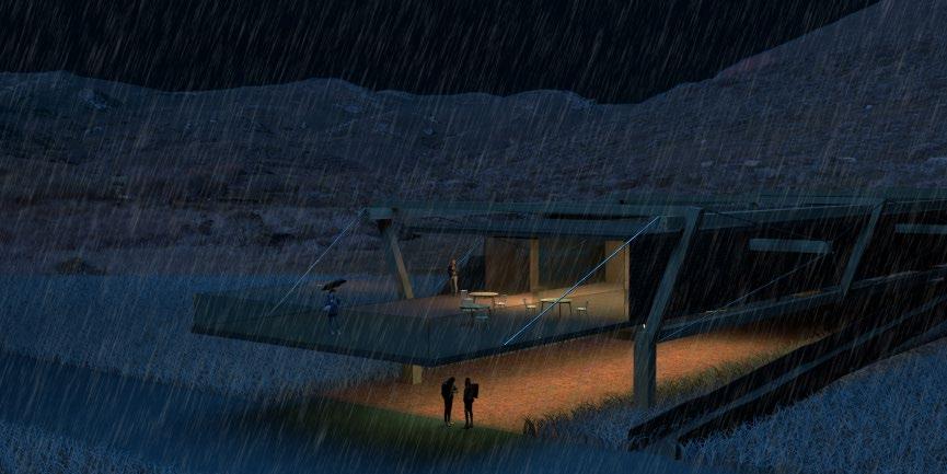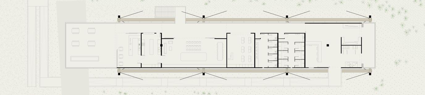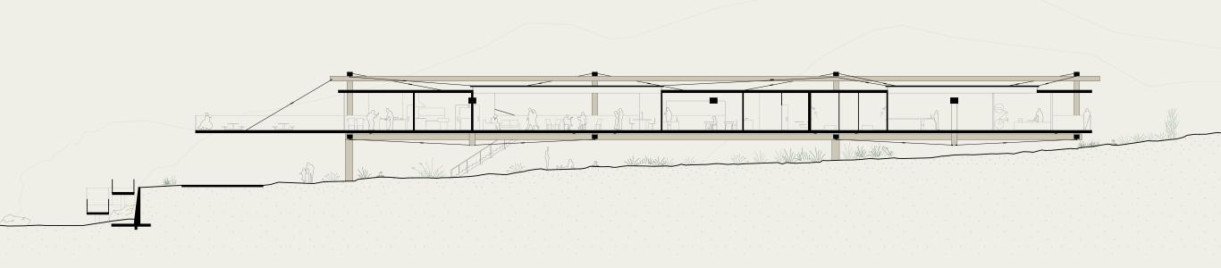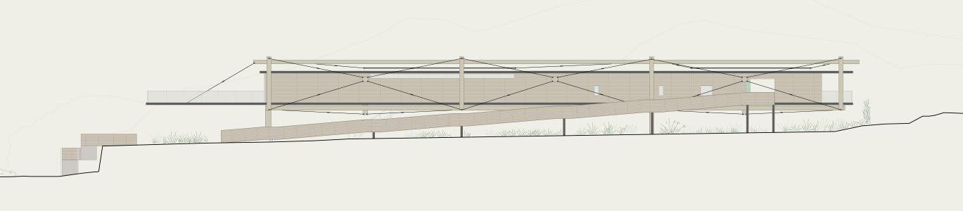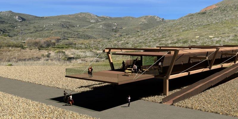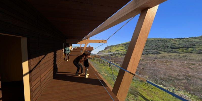 The Continuity Rodeo Experience Center, replacing the Rodeo Beach Station, serves as a versatile public facility catering to visitors of Rodeo Beach, Lagoon, and Marin Headlands trails. It replaces existing amenities like picnic grounds and shower facilities while adding a café, kitchen, event hall, and spaces for sporting activities. The striking mass timber construction balances the paved world of cars and the natural hiking and biking terrain, the project minimizes impact on the land using a unique strategy inspired by tension, compression, and tensegrity principles. Supported by a mass timber columns, the building integrates with the surrounding marsh, allowing natural expansion. The site offers diverse views, from historical military structures to the north, a complex lagoon-ocean beach relationship to the south, and natural hills and marsh to the west. Opposite the west, a parking lot and historic cabins serve as traditional indicators of arrival to the Marin Headlands.