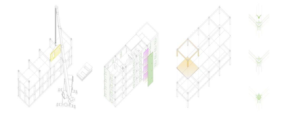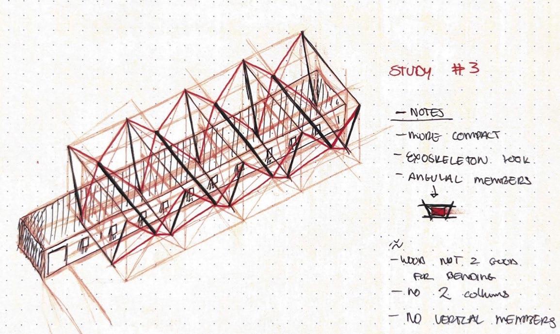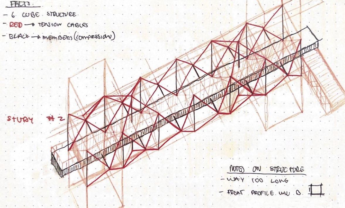 The project began with sketches, primarily in axonometric view, as it helps me better understand the shapes I draw. When sketching, I like to use different colors to represent various components. In this case, I used color to indicate members I envisioned being in tension or compression.
