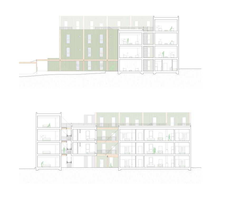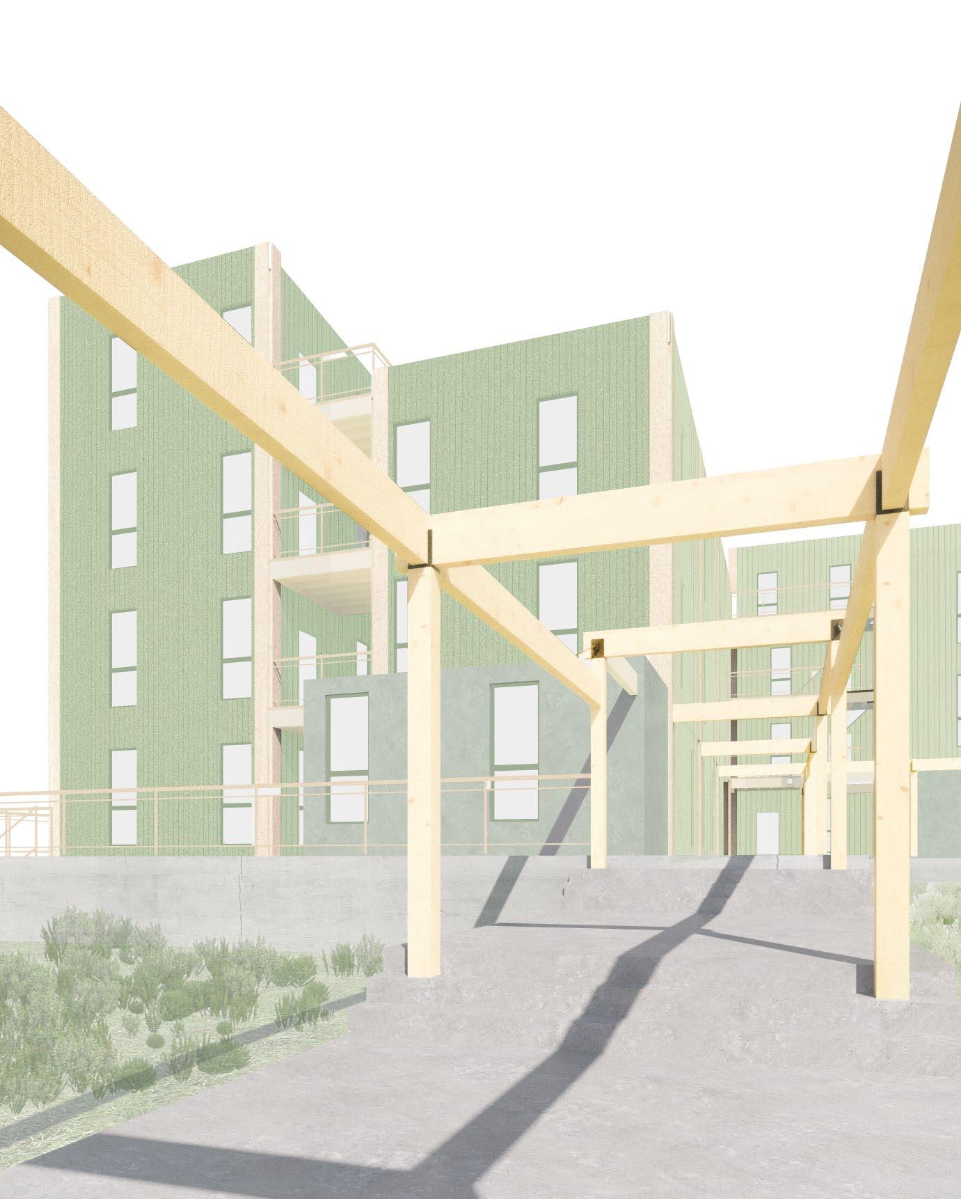 The White Pines apartment complex, a 20-unit development, serves the Portola neighborhood, drawing inspiration from the area’s traditional materials and vernacular architecture. “White Pines” originates from Eastern white pine wood, known for its lighter tone than its Western counterpart. This wood is incorporated alongside other types in the building’s mass timber structural system, creating a cohesive and inviting facade that complements the neighboring homes. The homes represent a unification between the existing community and future developments for the neighborhood. The buildings design takes into consideration many perspectives, and techniques, for optimal and affordable execution as well as a well balanced design that does not distract but welcomes modern design.
