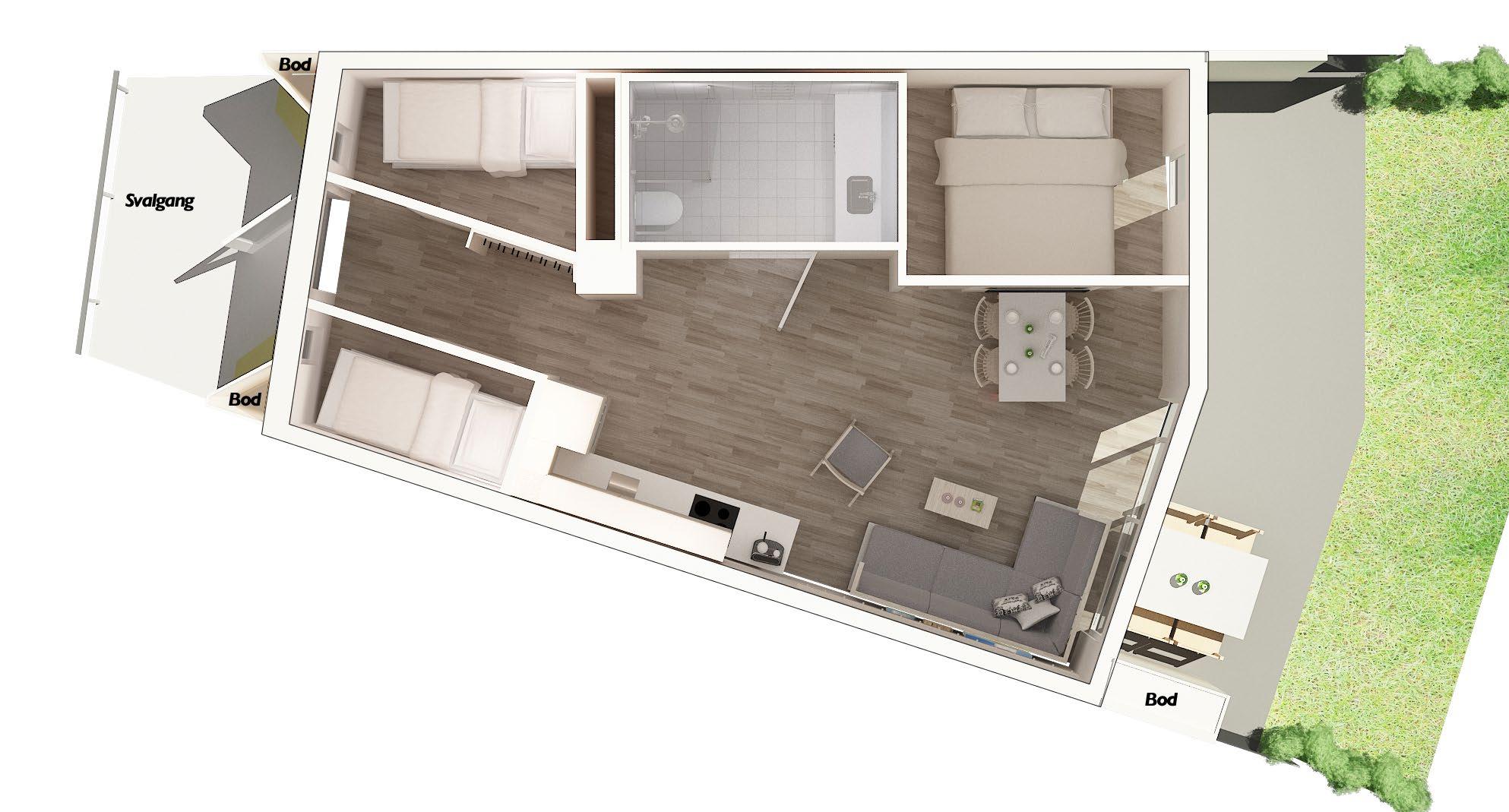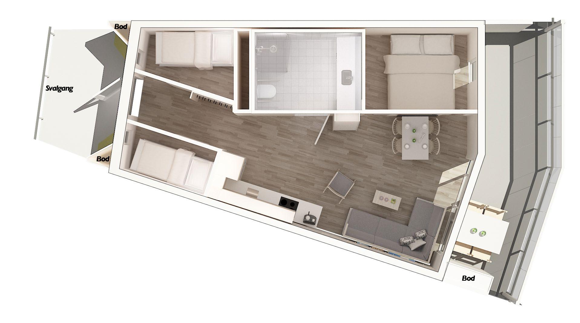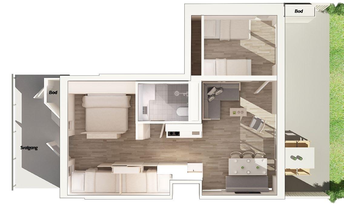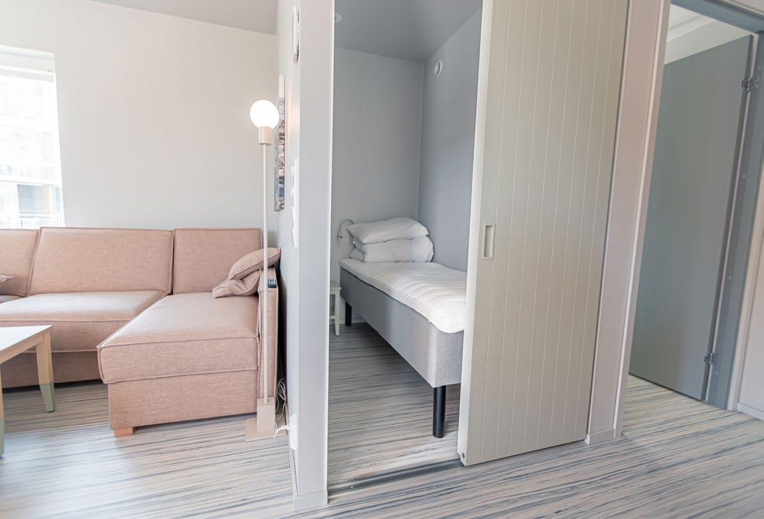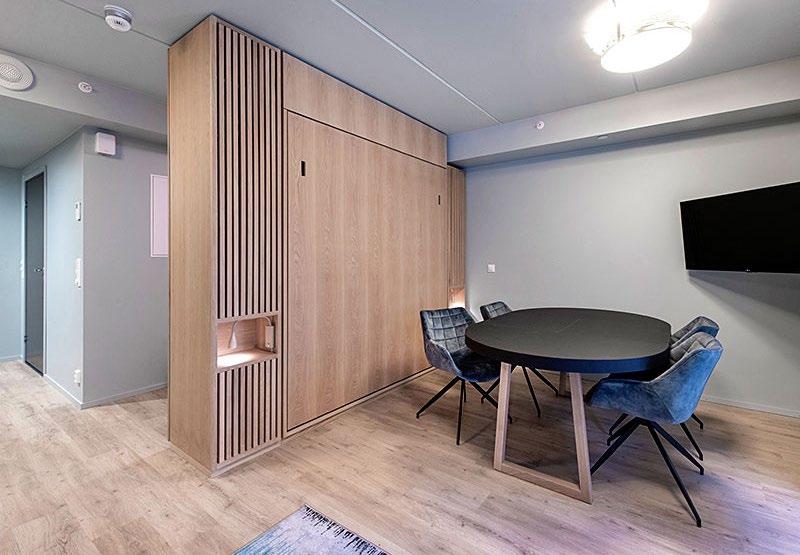 Suiten mit 36-47 m2 in den Langhäusern und Hochhäusern. Einige Suiten befinden sich im Erdgeschoss und einige sind behindertengerecht ausgestattet.