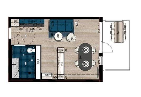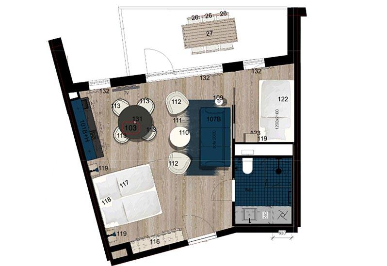 Suiten mit 26-34 m2 in den Langhäusern und Hochhäusern. Die meisten Suiten befinden sich im Erdgeschoss.