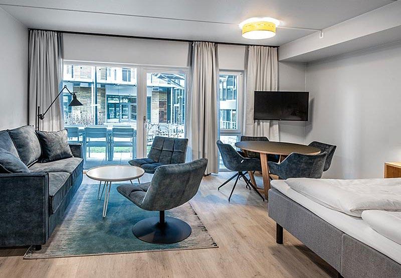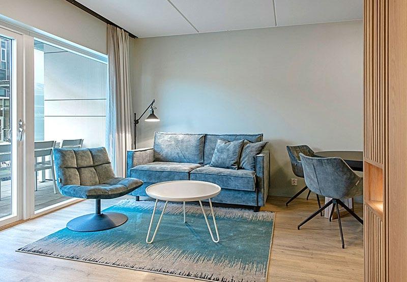 Suiten mit 37 m2 im Oslofjord Hotel. Alle befinden sich im Erdgeschoss und sind über den Innenflur zugänglich.
