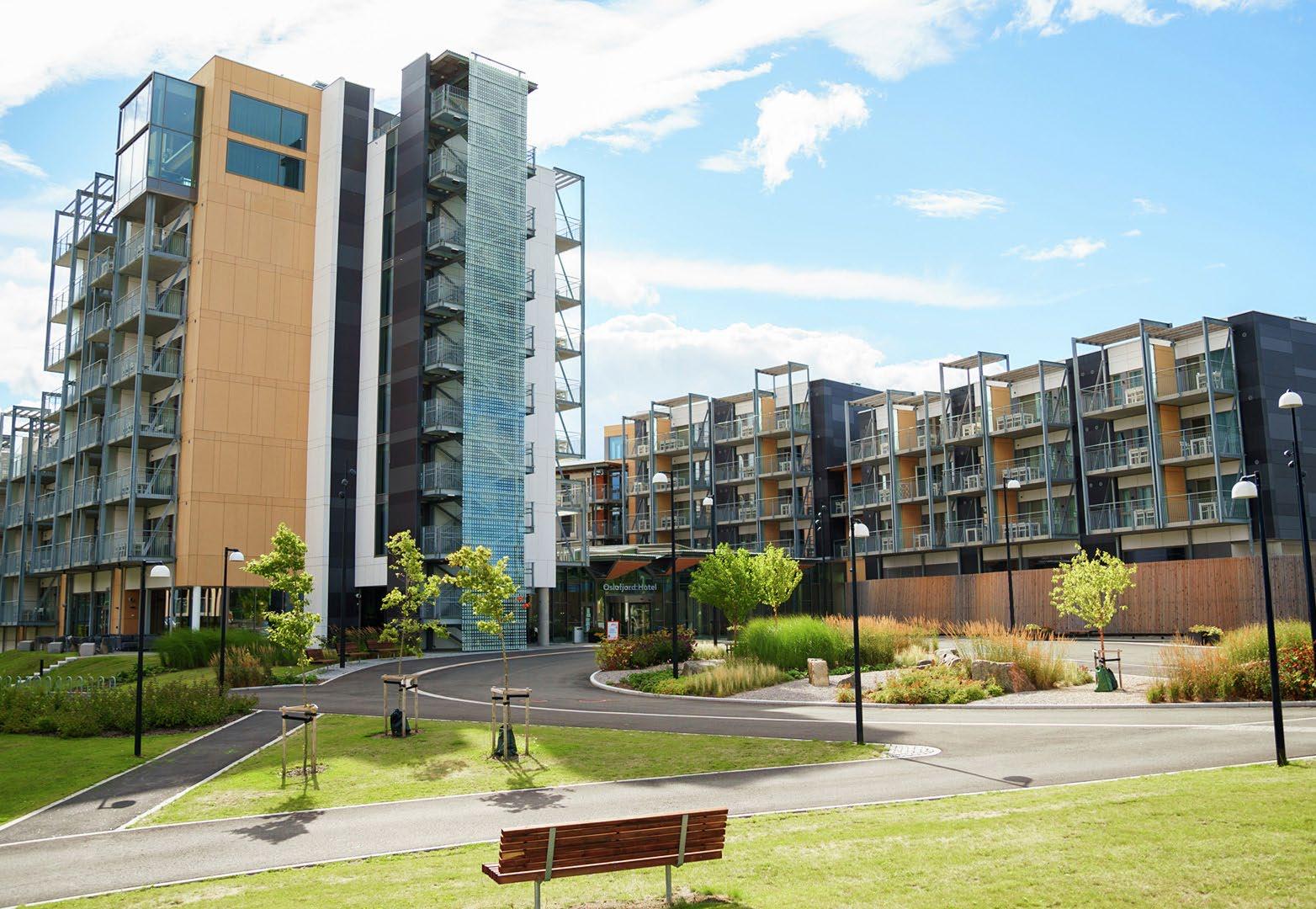 Hotelgebäude mit 1600 Hotelzimmern in 11 Langhäusern und 2 Hochhäusern, und Oslofjord Hotel mit direktem Zugang zu Gemeinschaftsflächen