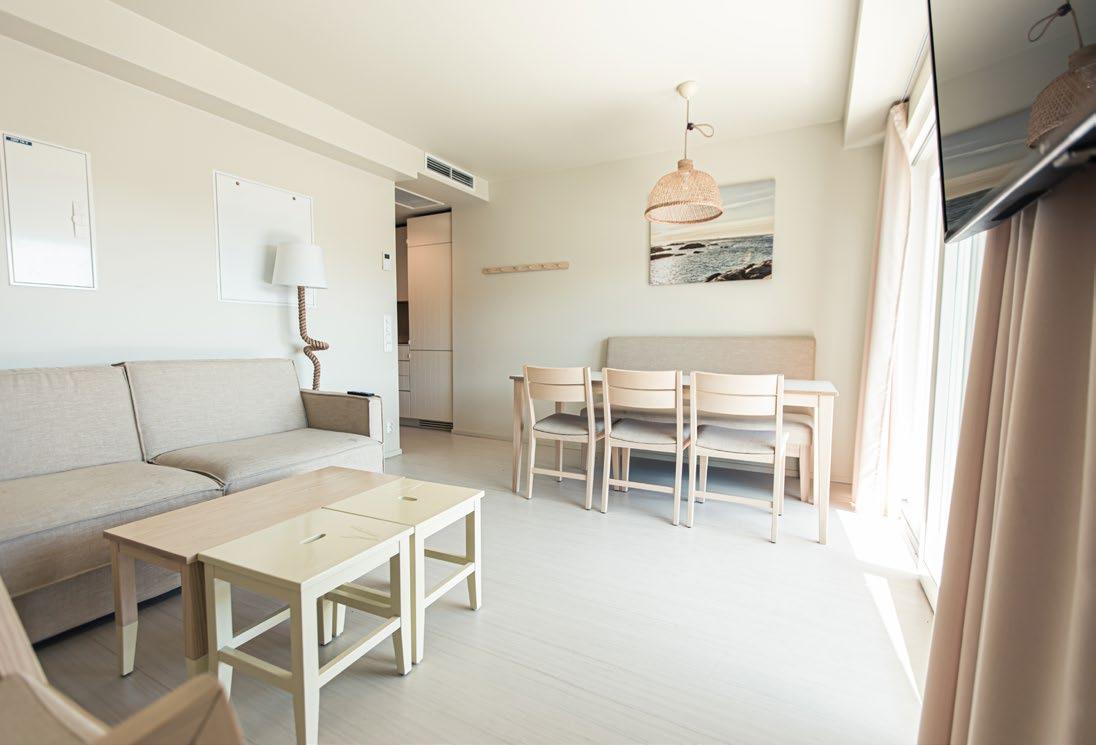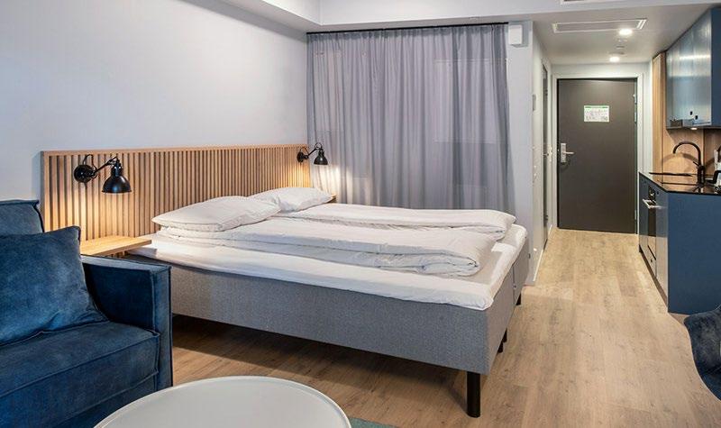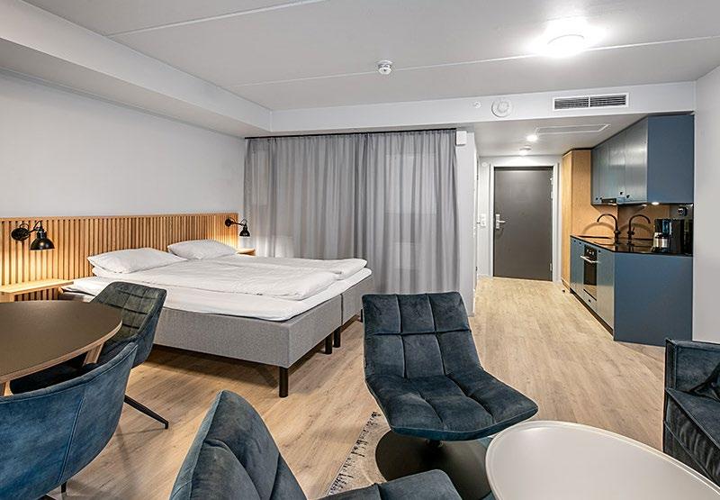 Inneholder hotellrom med hjørnesofa (ikke sovesofa), bord, 3 stoler og TV, kjøkken med kjøleskap, komfyr, oppvaskmaskin og nødvendig kjøkkenutstyr, samt bad med dusj og vaskemaskin.