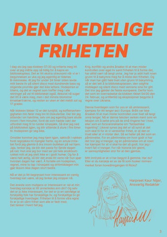 Det samfunnsvitenskapelige fakultett Universitetet i Bergen Fosswinckelsgate 6 5007 Bergen Trykk Molvik Layout Stian Fliid & Herman Hals Omslag Tobias Ree Heggdal Ansvarlig redaktør Harpreet Kaur Nijjer Samfunnsredaktør Marita Haugsdal Kulturredaktør Harpreet Kaur Nijjer Webredaktør Ingeborg Gloppen Johnsen Økonomiansvarlig Jens Philip Magnus Some-ansvarlig Ingeborg Gloppen Johnsen Skribenter Aksel Haukom Emma Tries Harpreet Kaur Nijjer Ingeborg Gloppen Johnsen Jens Philip Magnus Marita Haugsdal Sigbjørn Løland Torpe Tess Zondervan Ustat Kaur Bedi Zoé de Metz Illustratører Elise Gaeremynck Ena Rathgeb Ingeborg Gloppen Johnsen Julie Larsen Kari Borg Hommerstad INNHOLD 03 Leder: Den kjedelige friheten SAMFUNN 04 Uenighet, ytringsfrihet, respekt. 06 Why being young can feel daunting 10 Til deg som står på sidelinjen 12 Menn må tro for at kvinner skal lykkes 14 Hva om…? Prinsessa var skeiv 16 Where has the magic in adults gone? KULTUR 18 Modern days manifestation 20 En utfordrende middag 24 Rick’s: Skrekkens hus 28 Discovering a different way of life Hvordan forene disse prinsippene?