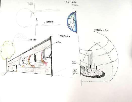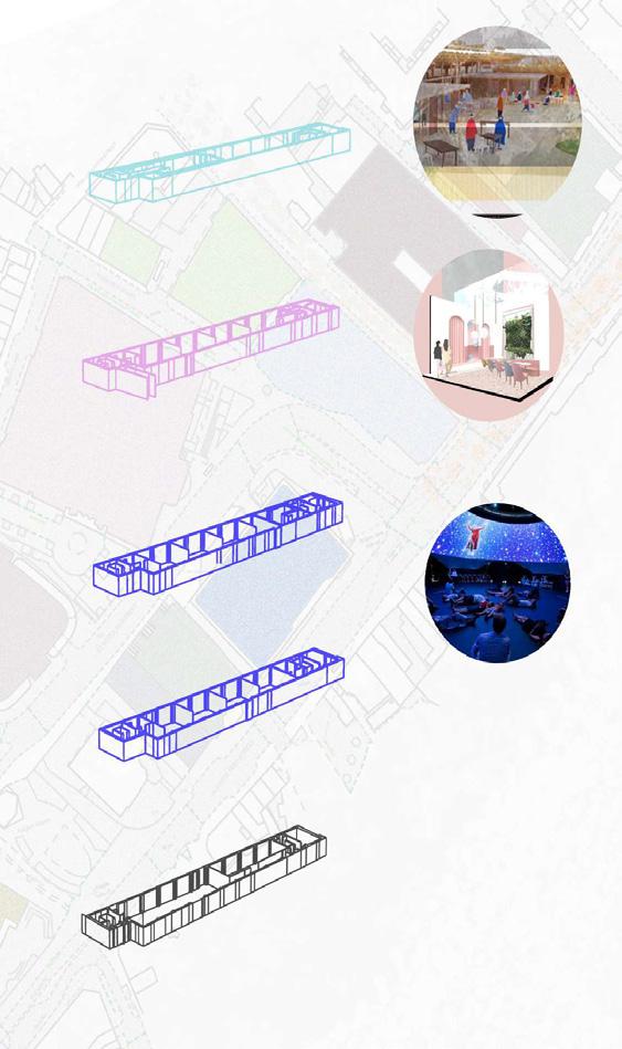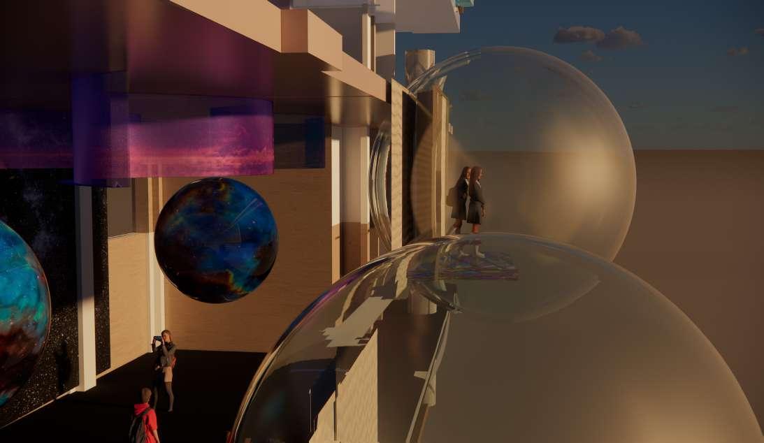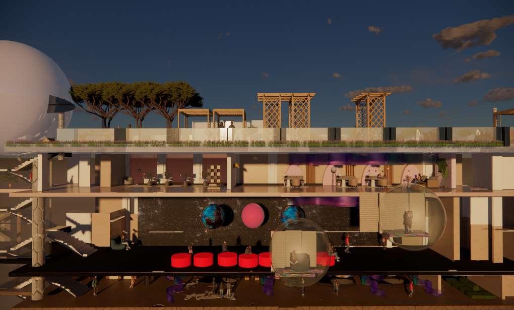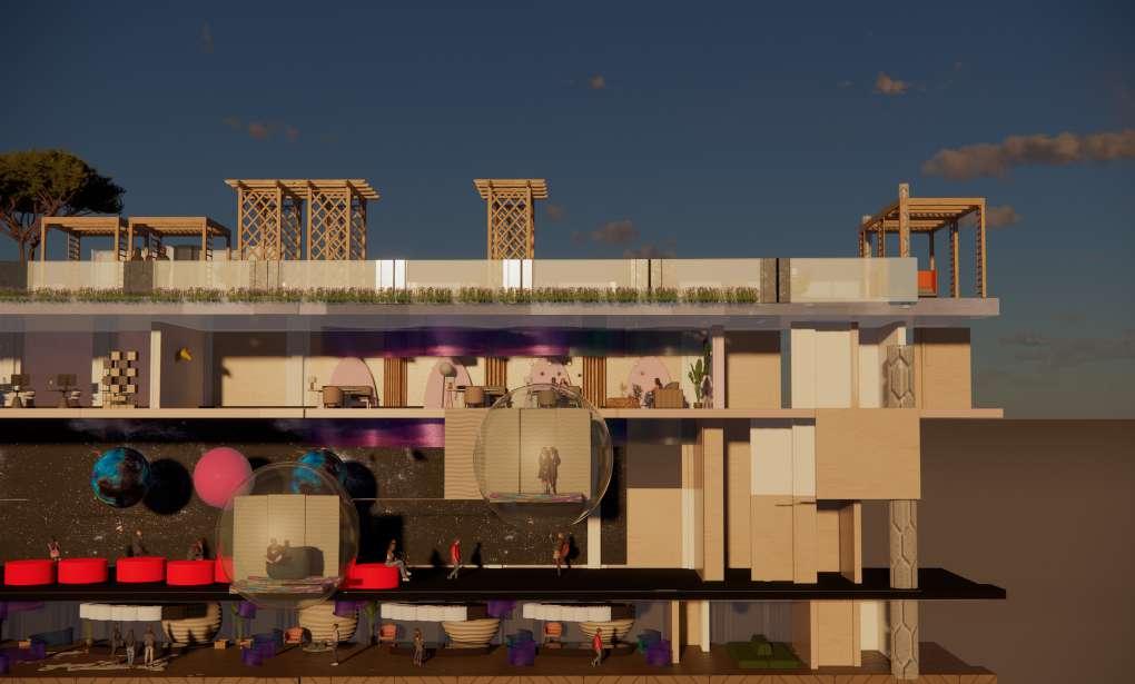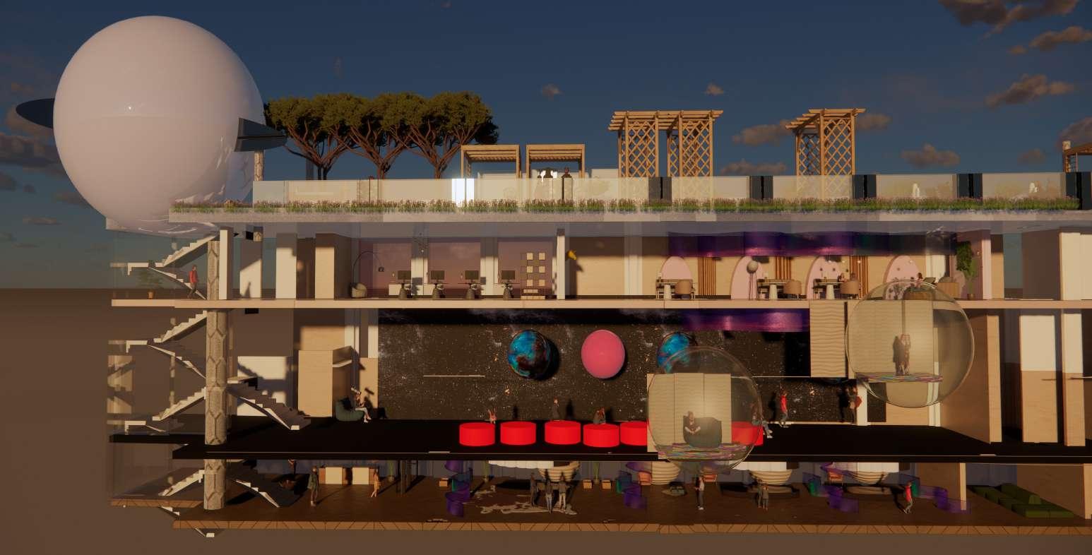 Inspired by the Bubble house representing the idea of a bubble soap covered by pink blossom, the spherical forms create sensuous interior spaces when they intersect, creating six bubbles with different interior spaces surrounded by transparent glass, where you can feel and see nature in every view. Taking into consideration my concept, started to think on how the local teenager would be attracted to come inside.