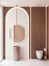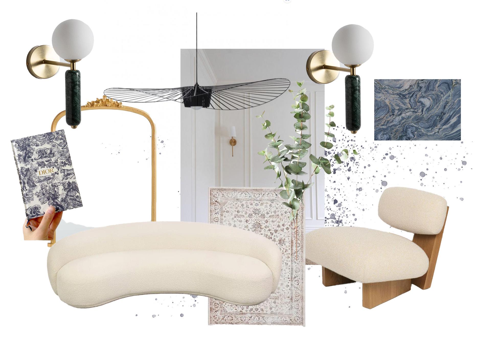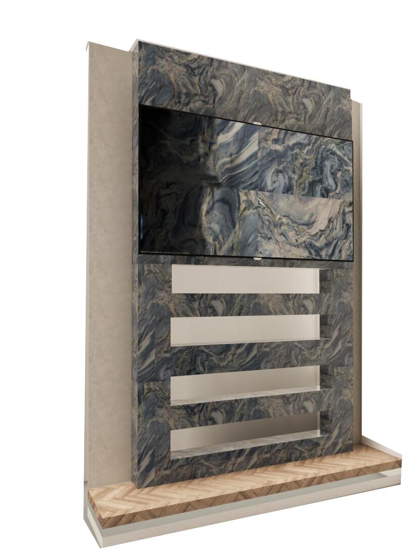 The living room features a stylish wall panel, reminiscent of classic London design, complemented by a contemporary marble wall shelf. This combination adds a touch of elegance and modern sophistication to the space.