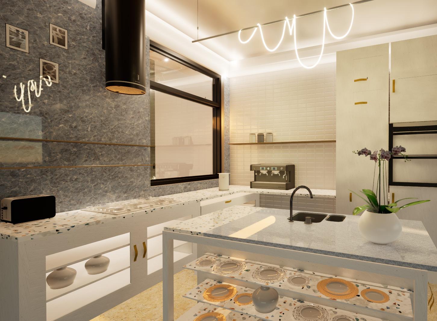 The kitchen is custom-designed with white oak-veneered cabinetry, providing a warm and elegant aesthetic. The workspace features a sleek white Levanto marble countertop, enhancing both the functionality and sophistication of the kitchen A marble wall for an elegant touch.