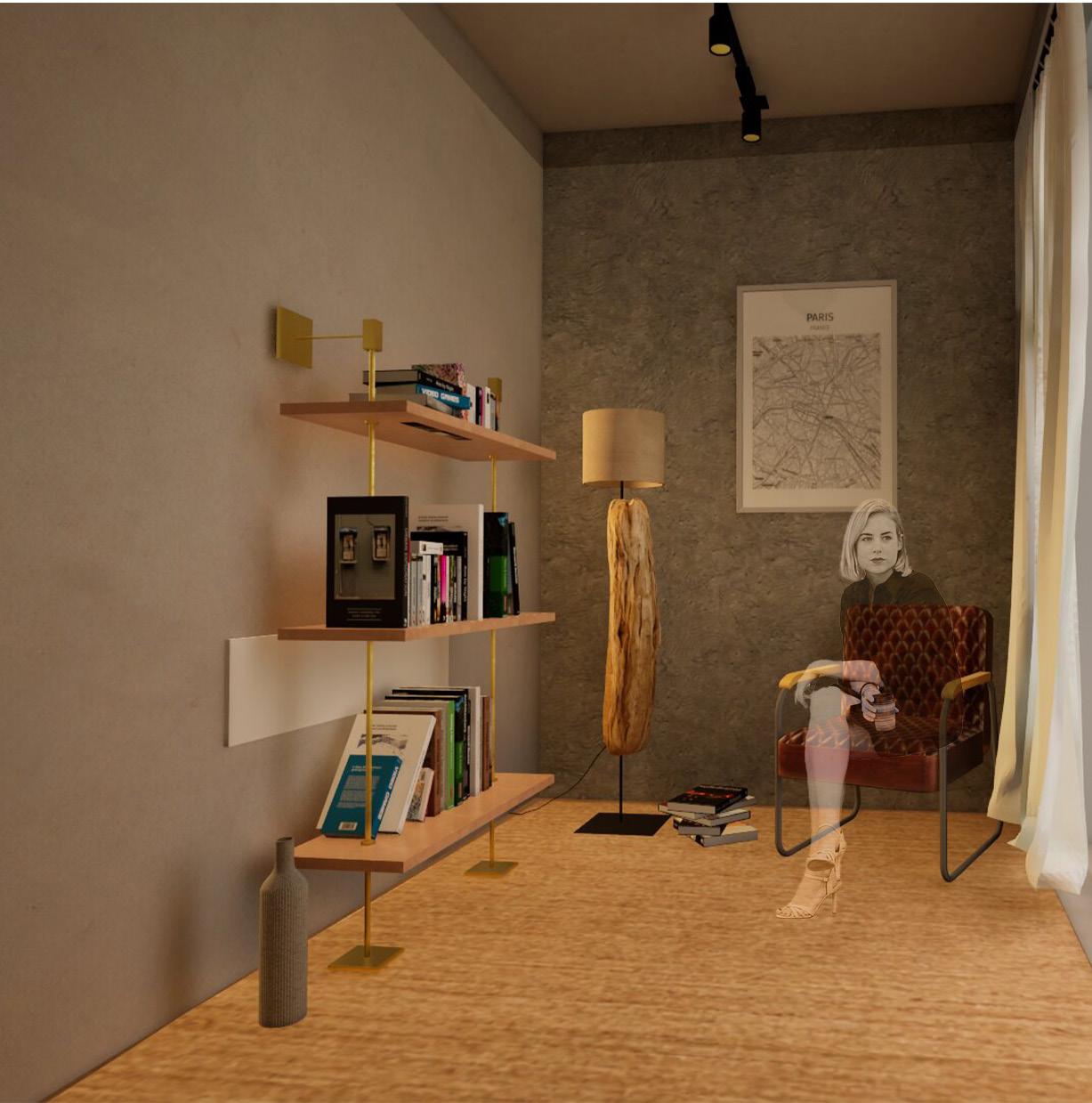 The reading space is thoughtfully designed to provide a clean and elegant environment, perfect for sitting down and enjoying a book. It combines simplicity with sophistication to create a serene and inviting atmosphere.