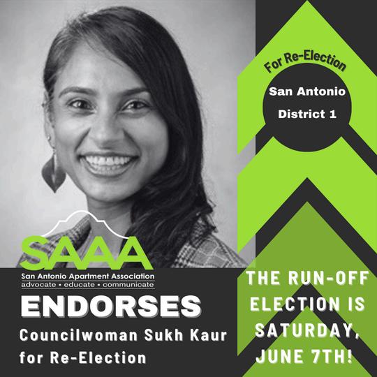 The San Antonio Apartment Association endorses Councilwoman Sukh Kaur for reelection.