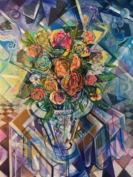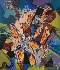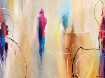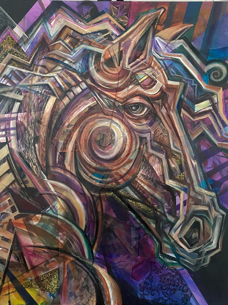 A: My artwork would speak about me as a weaving loom and a visual storyteller. My artwork embodies an interconnecting process that includes collage with cubism I can bring together patterns and colors and then extend those patterns and colors with oil or acrylic paint. Most of the time I have a narrative by working with a single word For example, my previous show was titled "Abundance", so I elaborate on that word and its subtext. When you look at my work, it really has a lot of layering, texturing, and imagery in it. For me as a person, I may seem like an extrovert as I used to own a gallery and be amongst many people This gives many the impression that I am very outgoing, but I really am very introverted and cherish my alone time. I can deep dive into myself when I'm in front of my canvas and start layering up the surface with paper collage and paint I also challenge myself by experimenting with different visual ways of manipulating color and patterns. I am pretty much an introvert, but of course, my art wouldn't say that about me since it's very explosive in color, shapes, and patterns. I would say that I'm also a contradictory artist