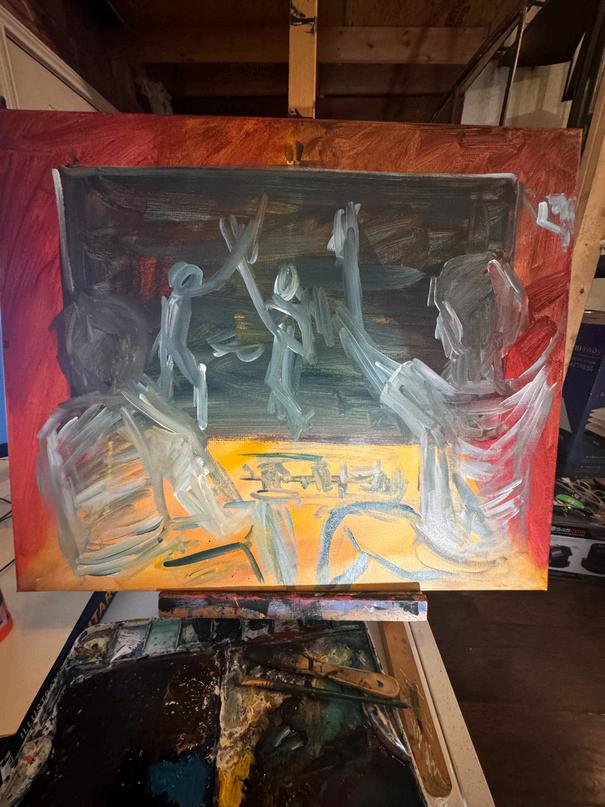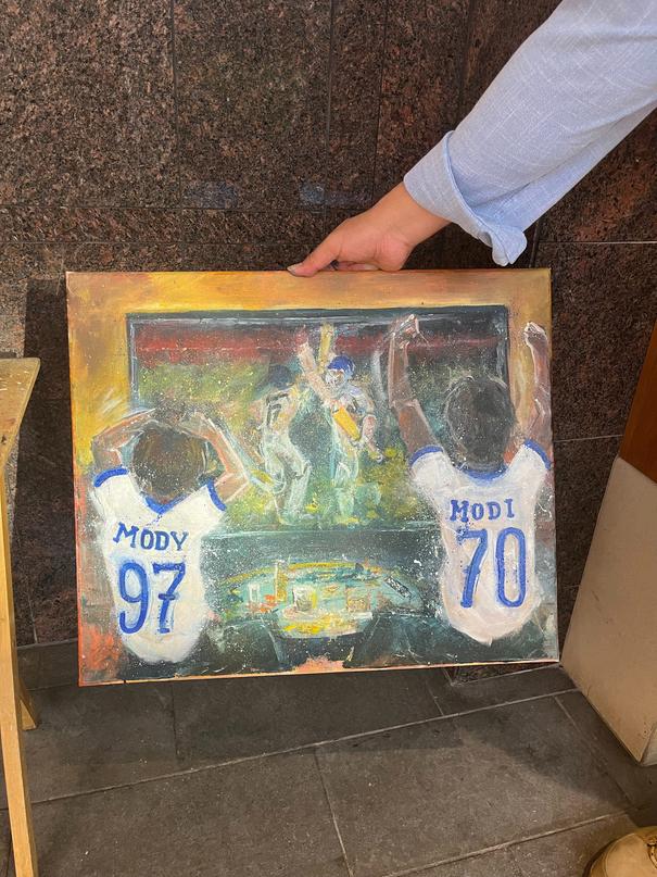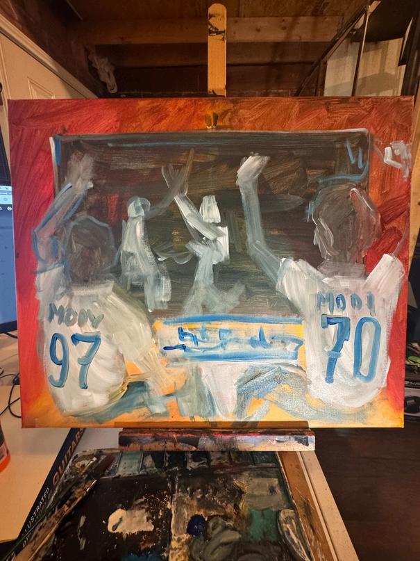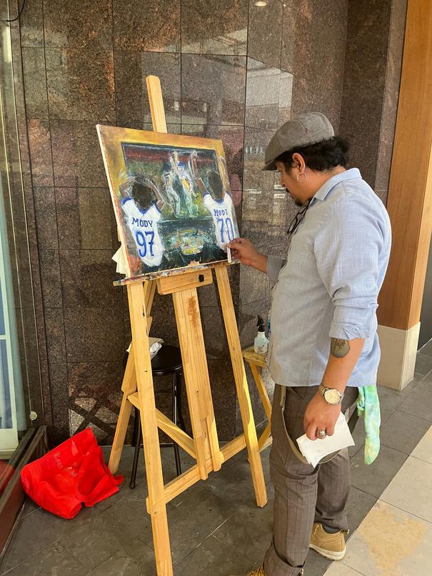 In a heartwarming project, customer Raj recently ordered a custom commission painting from artist Joao Quiroz to surprise his father for his upcoming birthday. The San Antonio Artists Collective is thrilled to have been a part of creating this special and unique gift Raj requested a painting that captures a cherished moment of him and his father watching India beat Australia in the January 2021 cricket match on TV. The artwork vividly depicts the duo sitting together, deeply engrossed in the game, and cheering joyously for their team. The painting's creation was documented step by step through a series of images showcasing Joao's skill and dedication Joao even made a special trip to the gallery to live paint this piece, adding an extra layer of personalization to the commission. The final reveal was a touching moment, with Raj and his father excitedly holding the painting together, reliving the memorable experience This project highlights the power of art to capture and preserve personal memories Those interested in commissioning their custom piece should visit our website and click the commission tab for a quote