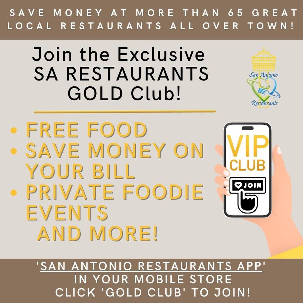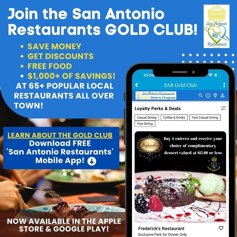 Download the free San Antonio Restaurants Mobile App for the latest Foodie Resources and click on 'Gold Club' to join and save money when you go out to eat at local restaurants!
