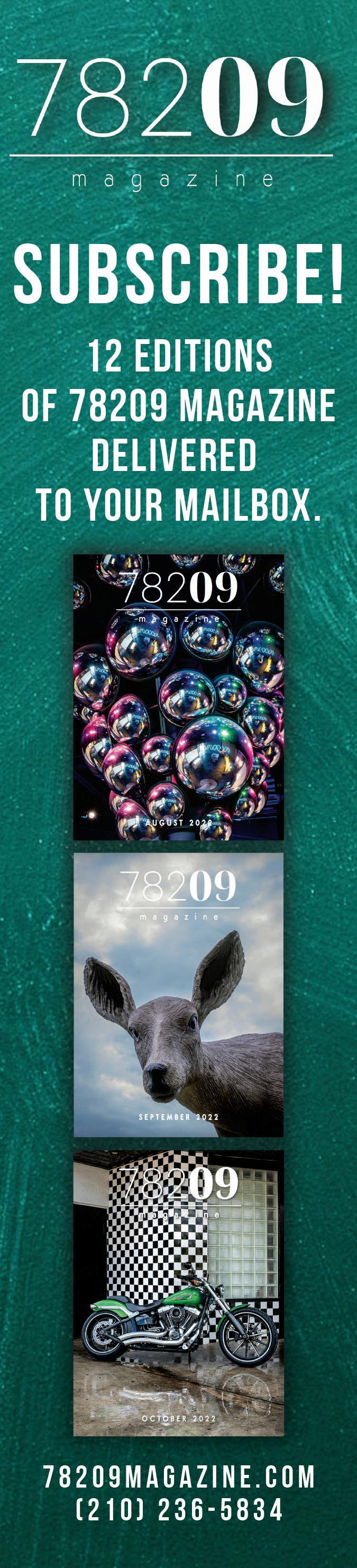 To view us online, visit: 78209magazine.com | To Subscribe: $19.95 (one year) Contact us: info@78209Magazine.com | (210) 236-5834 Follow us on Facebook, Instagram, and Twitter! | @78209magazine