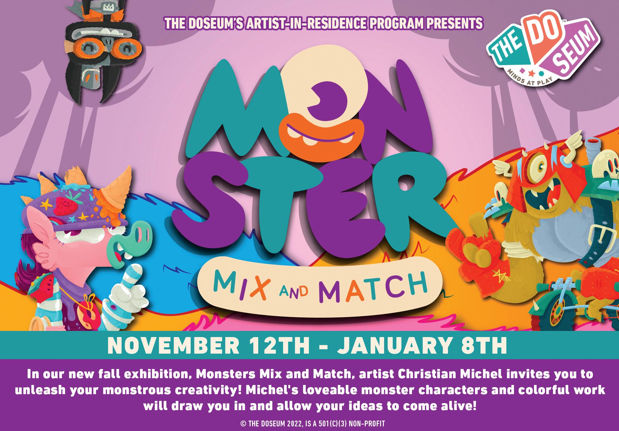 In our new Fall exhibition, Monsters Mix and Match, artist Christian Michel invites you to unleash your monstrous creativity! Playfully interact with his various monster characters through giant blocks, a lighted drawing table, codrawing game, and much more. Michel’s bright and colorful work will draw you in and allow your ideas to come alive!