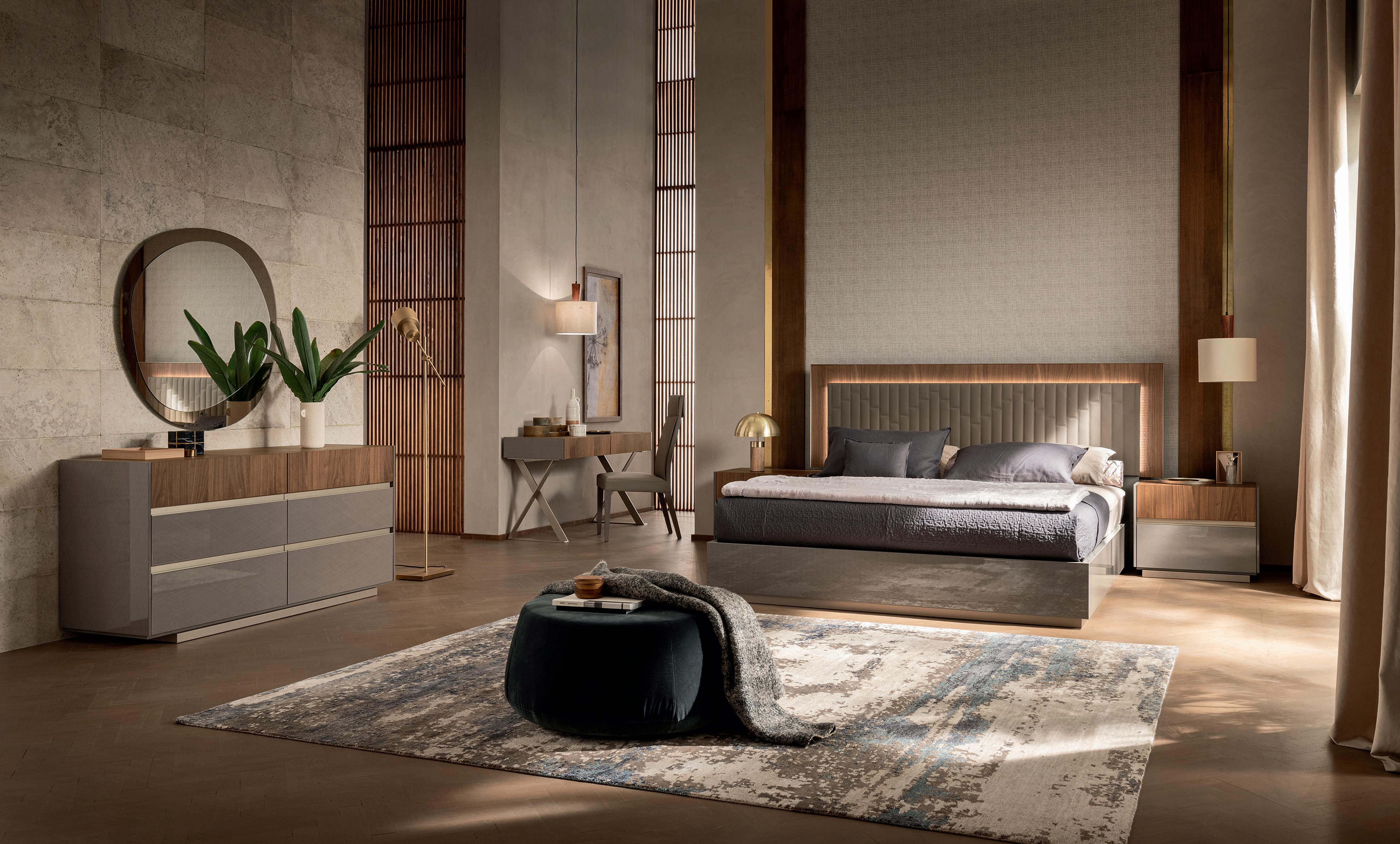 This magnificent bedroom is 100% made in Italy and is a perfect blend of elegant finishes and contemporary design. The combination of natural walnut and high gloss panels comes together to offer a unique blend of warmth and sophistication. By employing the latest in modern manufacturing while remaining conscious of our environment, our Italian bedroom offers exceptional quality and a truly distinctive look and feel. These items are available from stock for quick delivery.