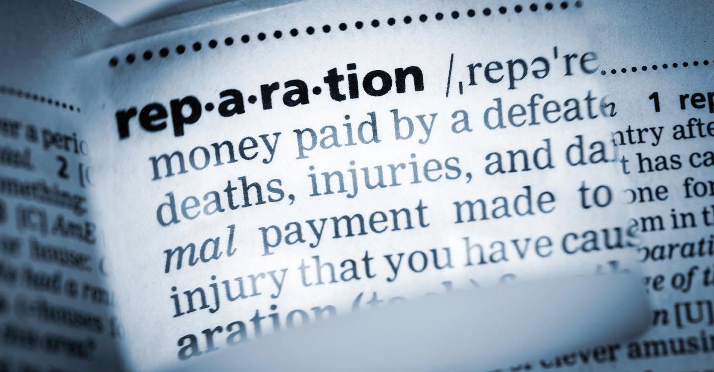 The Dictionary definition of the word “reparation” photo taken through magnifying glass from a page of a dictionary with selective focus.