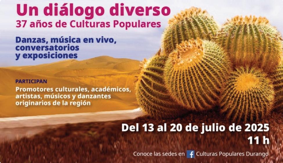 Victoria de Durango, Durango.— La Unidad Regional (UR) de Durango de la Dirección General de Culturas Populares, Indígenas y Urbanas (DGCPIU) de la Secretaría de Cultura del Gobierno de México celebra su 37° aniversario con una nutrida agenda de actividades culturales. Esto será posible gracias a la colaboración con el Instituto Municipal de Cultura de Gómez Palacio y la Dirección de Arte y Cultura de Lerdo.