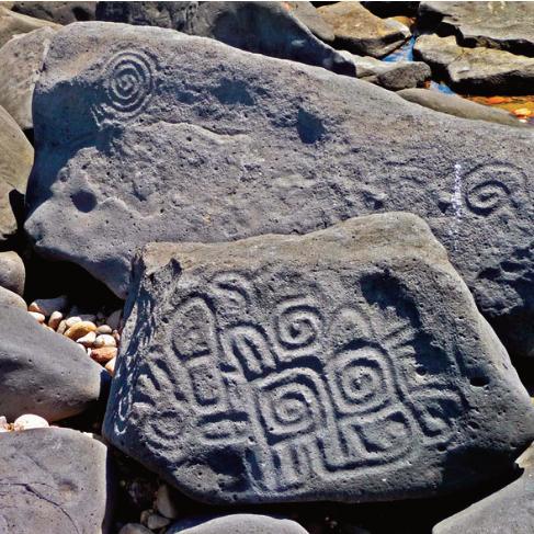 Estas manifestaciones artísticas se encuentran individualmente o formando paneles, dispersas sobre las oscuras rocas de tonalidades grises, cuya superficie lisa y redondeada por el oleaje las hace parecer esculturas naturales listas para el grabado.