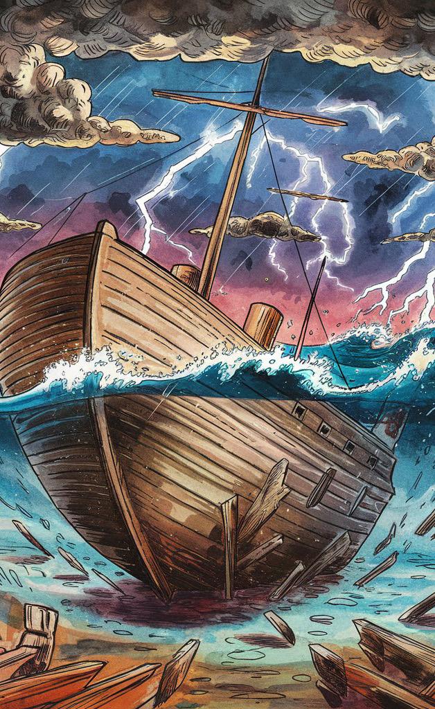 La fiesta seguía a bordo, pero el mar se encrespaba cada vez más. La Sirenita se dio cuenta en seguida del peligro que corrían aquellos hombres: un viento helado y repentino agitó las olas, el cielo entintado de negro se desgarró con relámpagos amenazantes y una terrible borrasca sorprendió a la nave desprevenida.