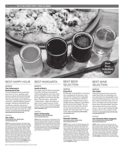 156 Avenida Del Mar, 949.492.3663, www.thecellarsite.com NOMINEES: Active Culture-Natural Foods Café • Avila’s El Ranchito • Barnoa Wine Bar • Beach Fire Restaurant • Bella Collina Towne & Golf Club • Big Helyn’s Saloon • Board & Brew • Brick Pizzeria • Bull Taco • Café Mimosa • Duke’s Griddle N Grill • El Mariachi Restaurant & Bar • Ellie’s Table at North Beach • Fratello’s Family Italian Restaurant • Goody’s Tavern • Hapa J’s • Inka Mama’s • Iva Lee Restaurant • Izza Pizzeria • Knuckleheads Sports Bar & Grill • La Colombiana Restaurant • La Siesta Mexican Restaurant • Los Patios Restaurant • McDonald’s • Molly Bloom’s Irish Bar & Restaurant • MRK Public • Mulligan’s Sports Bar and Grill • Nick’s San Clemente • Nomads Canteen • OV Tavern • Ole’s Tavern • Pierside Kitchen + Bar • Pizza Port • Poke + Roll 808 • Red Fox Lounge • San Clemente Wine Company • Selma’s Chicago Pizzeria • Sonic Drive-In • Sonny’s Pizza and Pasta • South of Nick’s • Sundried Tomato American Bistro • Taka-O Japanese Restaurant • The Rider’s Club Café • Tina & Vince’s Italian Delicatessen • Vine Restaurant & Bar • Zona’s Italian American Cuisine 2013 WINNERS: Gold: The Fisherman’s Restaurant & Bar; Silver: Sundried Tomato American Bistro