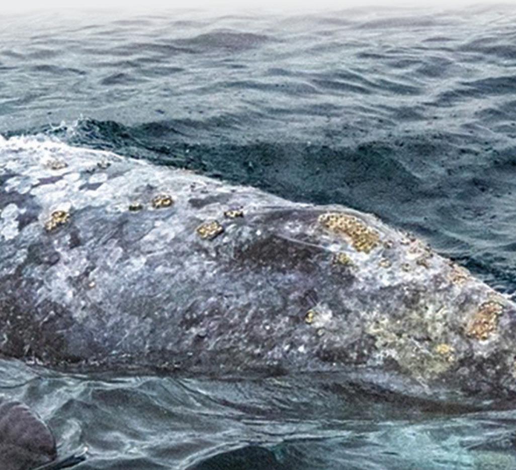 Gray Whales are baleen whales filtering their food through the rows of baleen plates that hang from their upper jaw like a broom or a brush. Unlike other baleen whales, Grays are unique in that they feed solely from the ocean’s benthic zone. Meaning, they feed on small organisms such as amphipods, mollusks and crustaceans, (shrimp-like organisms, tube worms, crabs) found on the ocean floor. Most scientists surmise that Gray Whales do little to no feeding during their seven-month migration up and down the Pacific Coast. The baby has grown utilizing the energy stored in the mother’s lipid-filled layers of blubber. Now on her southern migration, she will give birth. This female Gray Whale has left the arctic waters intent on giving birth to her young in the protected lagoons of Baja California, in particular, Scammon’s Lagoon, San Ignacio Lagoon or Magdalena Bay.
