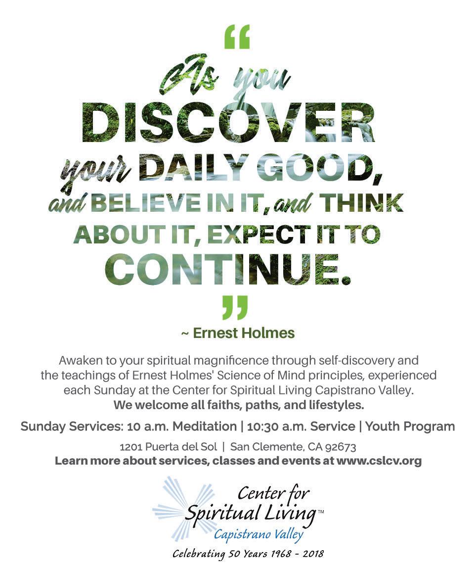 7-8:40 p.m. The San Clemente Toastmasters meets every Tuesday, with the doors opening at 6:30 p.m. so everyone can greet each other. San Clemente Baha’i Center, 3316 Avenida Del Presidente. 858.900.6175 sanclementetoastmasters. toastmastersclubs.org.