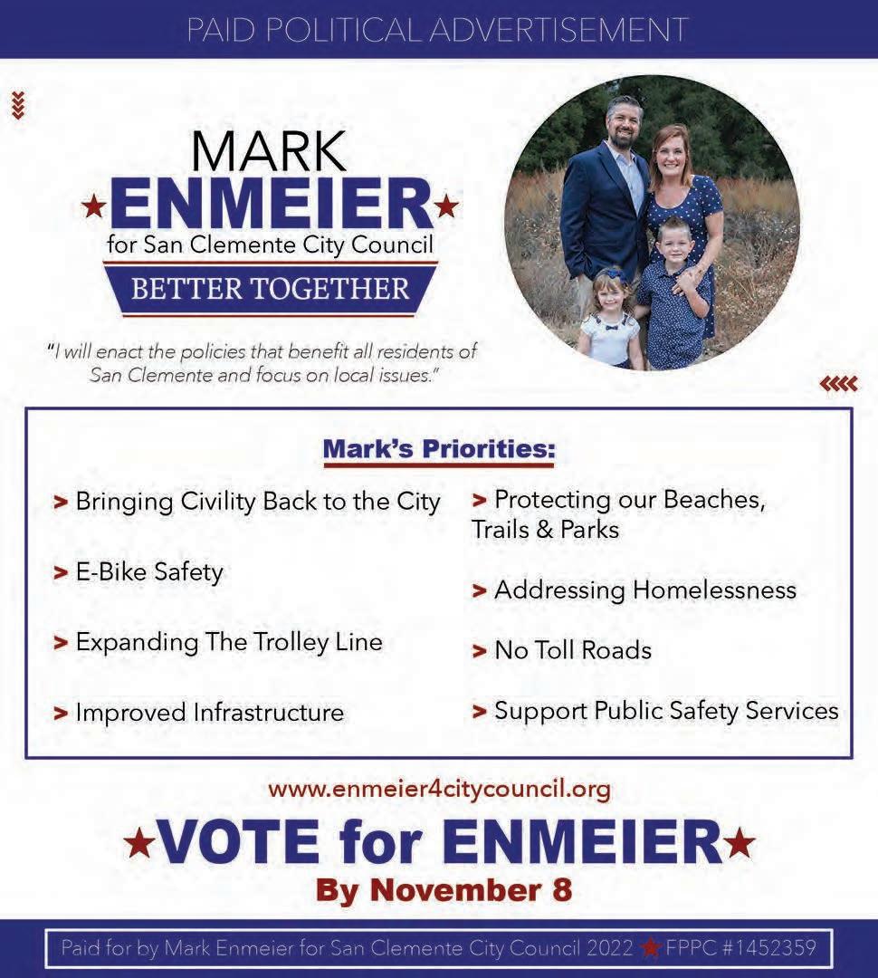 Enmeier, a San Clemente High history teacher, circled back to investing in the city’s infrastructure and beaches, using the adage “if we build it, they will come” to say visitors will want to come to a beautiful and functional town.