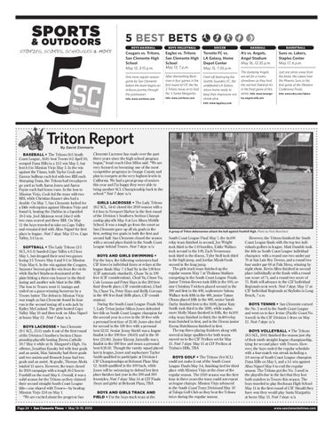 BOYS TENNIS • San Clemente earned the No. 2 seed in the South Coast League and went on to face Irvine (Pacific Coast No. 3-seed) in the CIF Division 1 draw on May 12. Next 7 days: n/a BOYS VOLLEYBALL • The Tritons (8-3 SCL, 19-9) finished the season just shy of their ninth straight league championship, tying for second place with Tesoro. However, the boys ended the regular schedule with a four-match win streak including a 3-0 sweep of South Coast League champion Dana Hills on May 5, and a 3-1 win against Aliso Niguel May 6 to end the regular season. The Tritons got the No. 3 seed in the playoffs due to the fact that they lost both matches to Tesoro this season. The boys traveled to play Beckman High School May 11 in the first round of CIF. Should they have won they would play Santa Margarita at home May 13. Next 7 days: n/a www.sanclementetimes.com