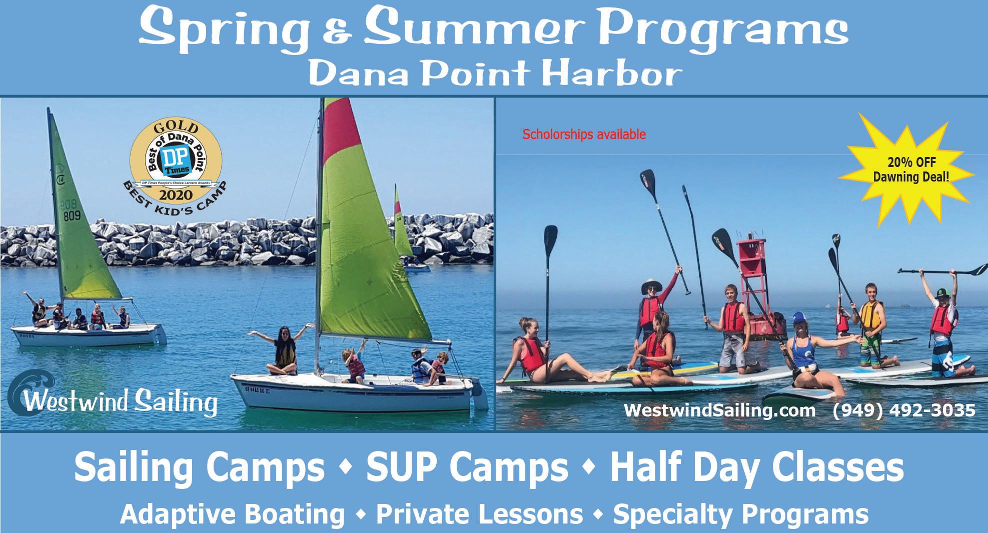 Welcome aboard! Westwind has been providing educational boating programs in our community since 1987. Our programs include sailing camps, SUP camps, and boating classes for all ages and skill levels. We are the 2020 “Best Camp for Kids” People’s Choice Golden Lantern winner in Dana Point, and our school is a sanctioned US Sailing, Community Sailing Center. Scholarships are available from Cal Boating and the Dana Point Aquatic Foundation (contact us for information). Find us at the OC Sailing & Events Center in DP Harbor. 949.492.3035.