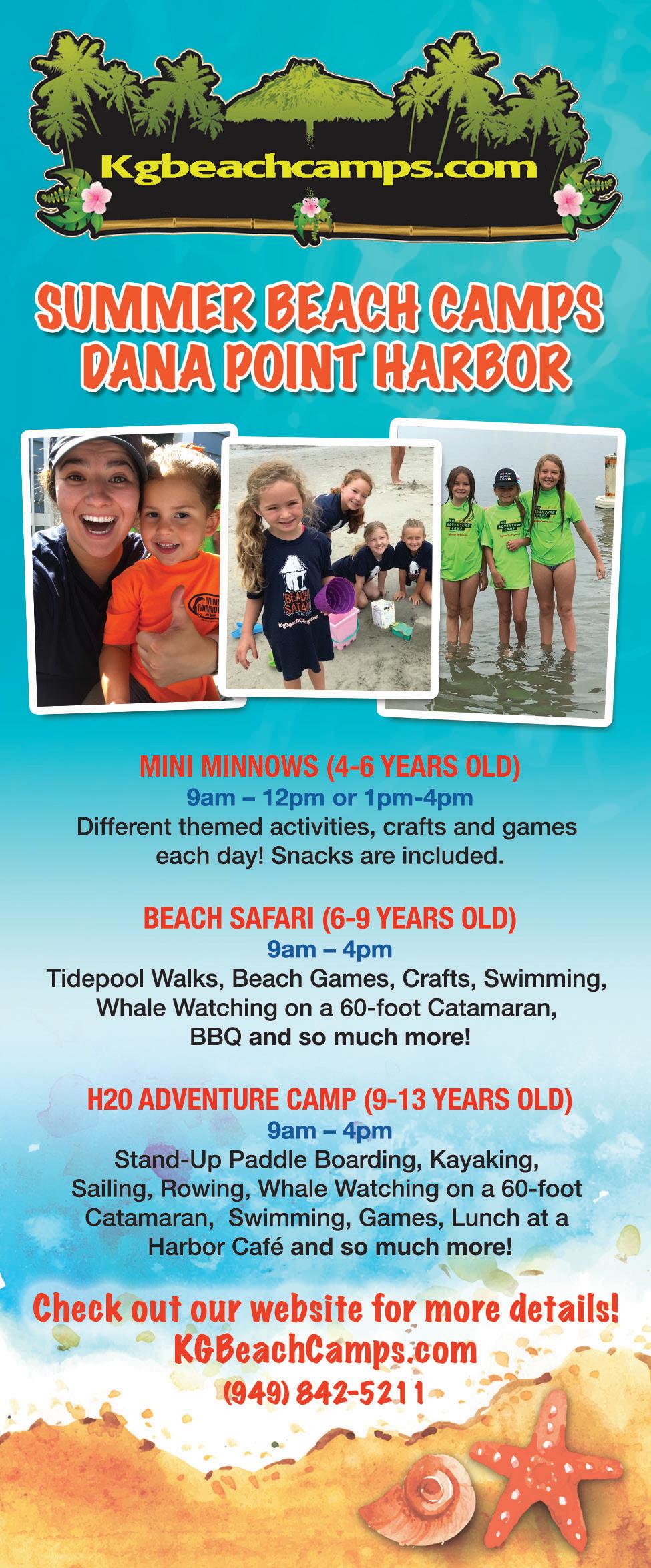 Come down to the Dana Point Harbor for a week of fun! There are activities from stand-up paddleboarding, sailing, kayaking and tide pool walks to games, crafts and much more. Join us for an adventure on a 60-foot catamaran while we look for whales and explore the open ocean. The little ones will join us for a different adventure every day; crab hunting, treasure hunts, water games and sand castles will fill their days at camp. 34451 Ensenada Place, Dana Point. 949.842.5211. kgbeachcamps. com.